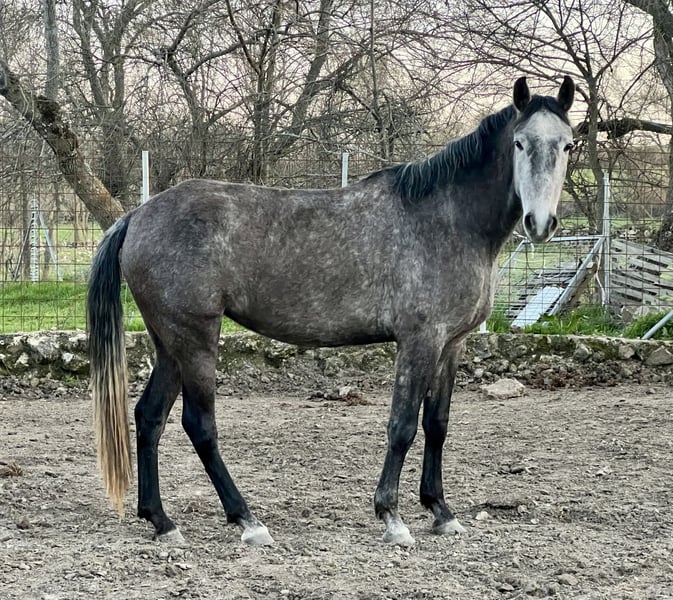 Hija de Fogoso y nieta de Califa. WhatsApp 0034 606330090 **Hermosa y prometedora yegua Lusitana en venta** Presentamos una elegante y prometedora yegua Lusitana, nacida en 2022, que combina belleza, carácter y potencial para la doma clásica. De alzada 163 cm, esta torda destaca por su porte equilibrado y su presencia imponente, perfecta para jinetes que buscan una compañera de confianza y con futuro en la disciplina. Desde temprana edad, ha sido bien manejada y está en proceso de aprendizaje en doma clásica, mostrando buen carácter y disposición para avanzar en su entrenamiento. Su carácter tranquilo y su inteligencia hacen que sea una yegua muy fácil de manejar y de montar, ideal tanto para jinetes en desarrollo como para profesionales que deseen formar a una futura estrella en la disciplina. Su linaje y conformación la convierten en una candidata excelente para competir en niveles altos o para disfrutar en la doma de forma recreativa. Además, su belleza y presencia en el ring la hacen destacar en cualquier entorno. Si buscas una yegua Lusitana con potencial, bien educada y con un futuro brillante en la doma clásica, no dudes en contactarnos para más información y concertar una visita. --- ¿Te gustaría que añada algún detalle adicional o alguna especificación más?