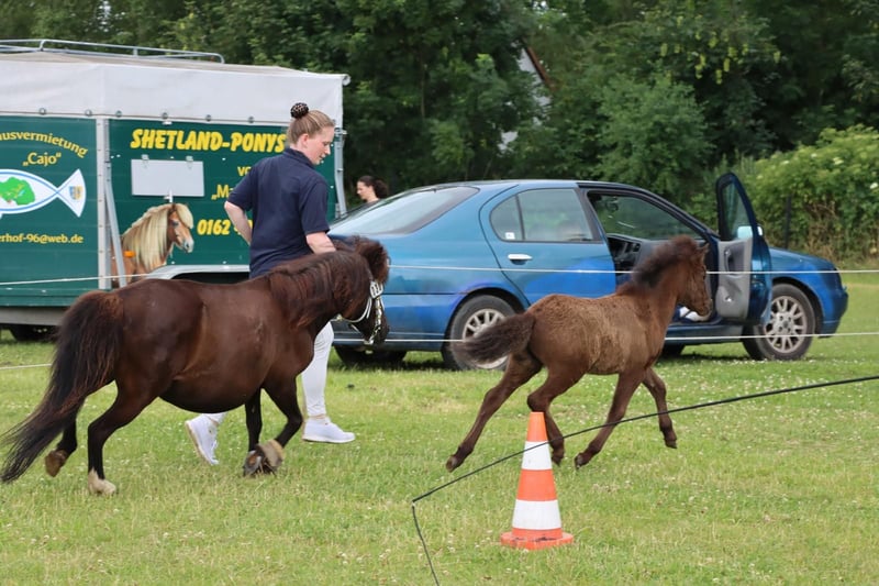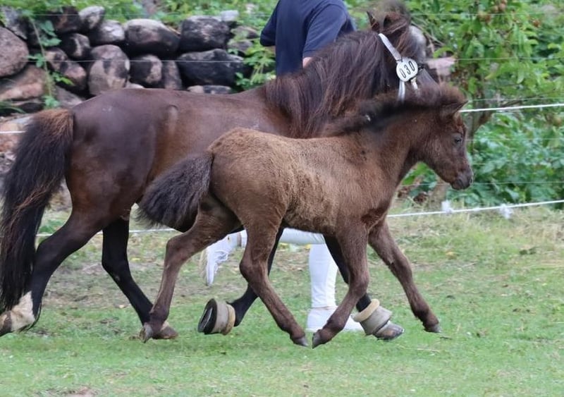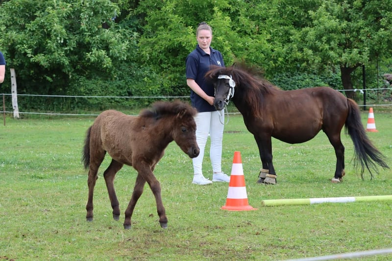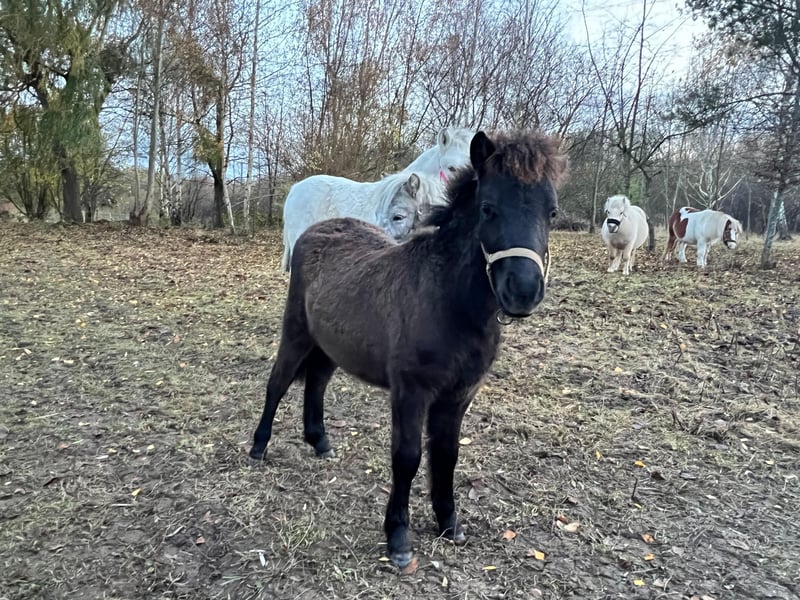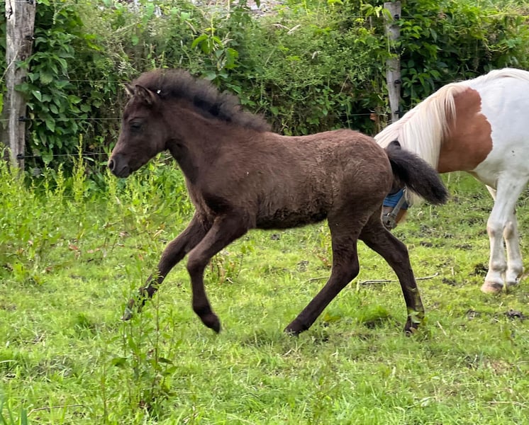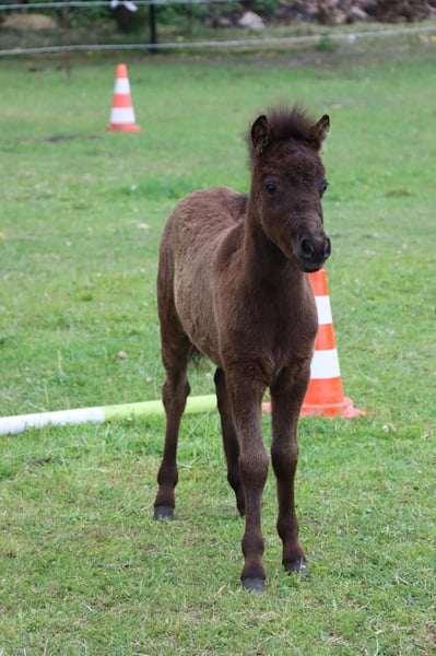 Unser diesjähriges Fohlen sucht nach dem Absetzen im November ein neues Zuhause. "Janikos Just in Black " zieht natürlich mit vollen Papieren vom Pferdezuchtverband MV, entwurmt und auf Wunsch auch geimpft in sein neues Heim. Justi wurde am 02.05.2025 geboren und ist ein Dt. Classic Pony, mit seiner Rappfarbe ist er somit ein kleiner Hingucker, er wird noch Tigern, Hufe bekommen schon weiße Streifen. (Lt. Gentest Tigerträger) Er wächst in Weide- bzw Offenstallhaltung auf, kennt auch Großpferde, ist E-Zaun sicher, Schmiede- & Verladefromm. Unsere Ponys bekommen mittels Blutbild angepasstes hochwertiges Mineralfutter. Seine Voraussichtliches Endmaß wird um die 110cm liegen, da er jetzt bereits schon 90cm groß ist und gerade wieder stark überbaut. Auf dem Elitefohlenchampionat MV könnte er sich die begehrte Elitefohlenprämie ertragen: Typ 9 - 9 - 9 Exterieur 9 - 9 - 9 Bewegung 9 - 9 - 9 Ab Dezember geht er in die Hengstaufzucht. Beide Hoden sind abgestiegen!