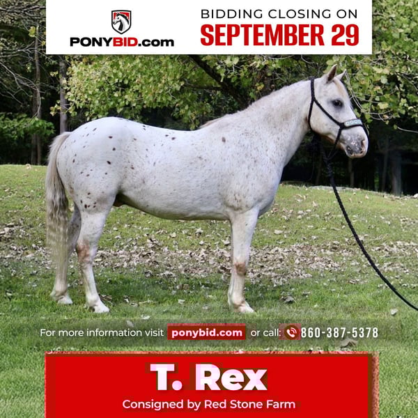 🐴 𝒕𝒉𝒆 𝐅𝐀𝐋𝐋 ℙ𝕆ℕ𝕐 𝑺𝒑𝒆𝒄𝒕𝒂𝒄𝒖𝒍𝒂𝒓🐴 Happening now thru MONDAY | SEPTEMBER 29th - Available EXCLUSIVELY on Ponybid's website! For more details and to register visit: www.Ponybid.com CONSIGNOR CONTACT: Red Stone Farm 860-387-5378 LOCATION: Granville, MA BREED: POA REGISTERED: No COLOR: Red/White HEIGHT: 12 AGE: 13 GENDER: Gelding T. Rex is a 13 year old red/white POA gelding standing about 12 hands high. This adorable guy is a been there done that pony. He's slow, quiet, cuddly and in your pocket. T. Rex is the pony you want for your kids, he is a true baby sitter. He knows his job is to keep his littles safe and happy! T. Rex is the MOST patient pony. He handles everything our 4yr old daughter throws at him. He will pack down the trail ridden independently or ponied off another horse, loves to go through the water and safe in traffic. We have encountered many dogs and wildlife out on our trail rides and T. Rex handles it all. He rides western and english and has the most comfortable little canter. He has jumped a cross-rail and crosses over tarps and logs. He spent this last summer teaching some lunge line through W/T/C lessons to beginners and loved all the extra attention from his riders. He has even been around some cattle. This pony is also an amazing driver, for anyone. He stands politely for you to get in the cart and will go wherever you point him. Our kids, who know nothing about driving have driven him all through the state forest. He is reliable and well educated. He stands quietly for grooming, saddling and loves a bath. Around the farm he gets along with everyone and is so easy to live with. No vices or issues or special requirements for him. He ties, crossties and stand great for vet and farrier. He lives in a loud home, wild children, chickens, dogs, equipment and multiple quads always flying around him and he never bats an eye. T. Rex has been trailered out for trail rides, gymkhanas and shows, he is the same pony off property. T.Rex is up to date with farrier, veterinarian work and worming. He is an easy keeper and his only special requirement is love.