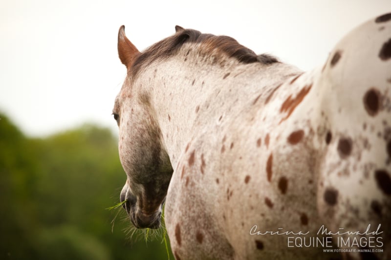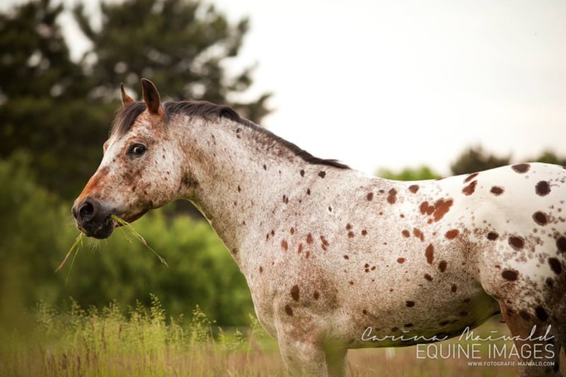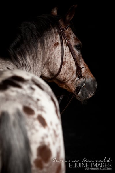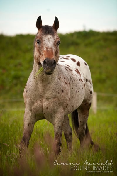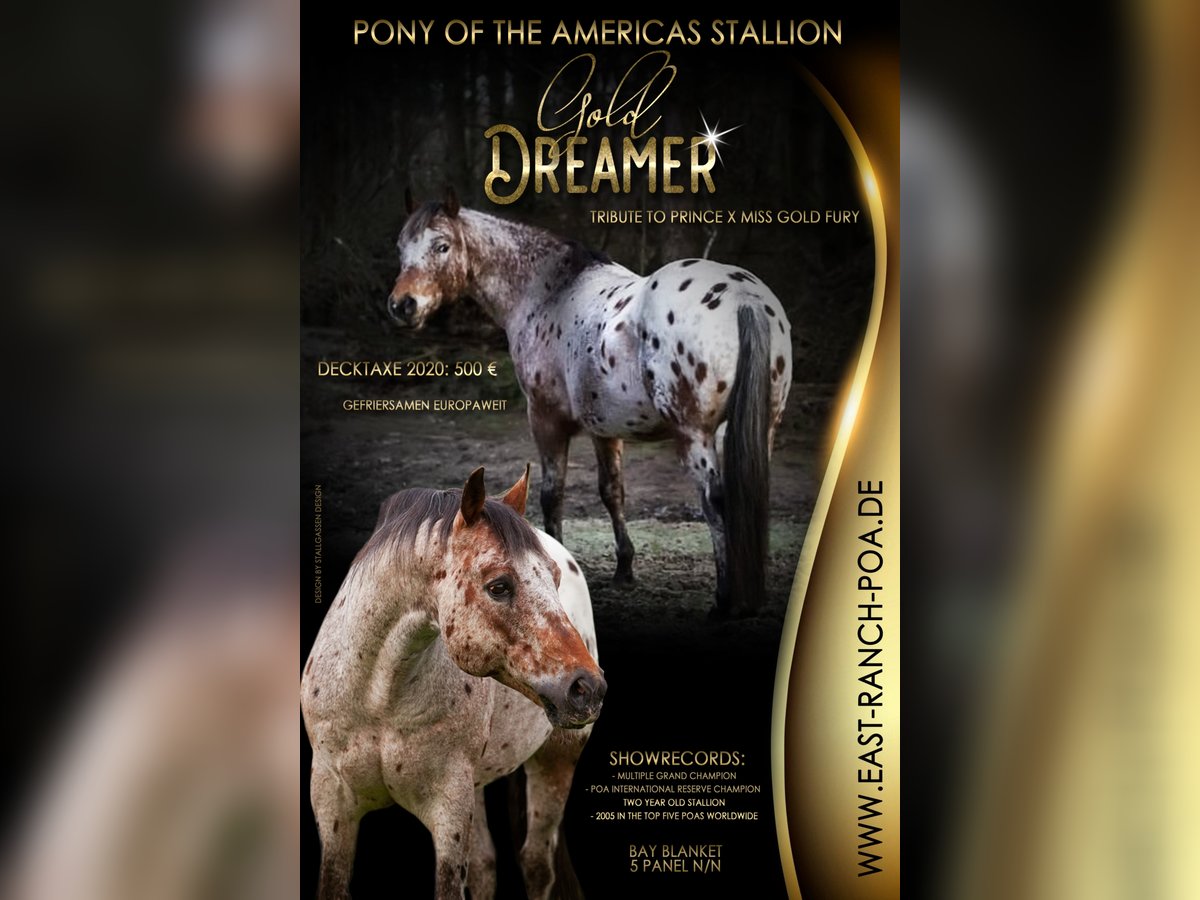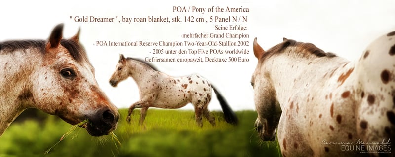 POA / Pony of the Americas Stallion " Gold Dreamer " b. 2000, bay roan blanket GBED, PSSM, HERDA, HYPP, MH n/n SPECIAL OFFER on the cover tax only valid for the 2020 cover season!!!! The seed can now be purchased and processed at a later date... take advantage of the opportunity, seeds are only available to a limited extent! If you have any questions, please contact us! A stallion with a rare fur drawing and a very special charisma. Its human-oriented, completely uncomplicated nature awakens in every horse man the desire for exactly such a horse. Gold Dreamer already fathered many above-average offspring - correctly built foals with a clear head, great muscle and strong joints. In addition, it is a "Proven Color Sire", i.e. it passes on its coloring very often. So if you want to take the chance to breed one of the last " Dreamer " foals, you can get in touch with us! Since Dreamer sadly died after a grazing accident, only limited freezing seeds are available. The shipment takes place via the stallion and deck station Steinsberg. Dreamer's seed shows a very good forward movement after thawing, which makes the successful receipt of her mare easy. Dreamer's achievements: - multiple Grand Champion - POA International Reserve Champion Two-Year-Old-Stallion 2002 - 2005 in the Top Five POAs worldwide Pedigree: https://www.allbreedpedigree.com/gold+dreamer