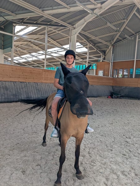 Ponette D – 14 ans – 1m45 - ONC Kaline est polyvalente et agréable, idéale pour du loisir sportif ou un projet évolutif. Déjà sortie en CSO, elle enchaîne 90 cm et peut sans souci aller plus haut avec un peu de travail. Elle a du peps, mais reste respectueuse, sans être dans le sang ni dans le rapport de force. Elle conviendra autant à un cavalier souhaitant progresser qu’à un profil plus confirmé. Elle a déjà vu des obstacles de cross, possède de bonnes bases en dressage et pourrait facilement évoluer en CCE. Tête froide, va toujours de l'autre côté. Habituée à travailler régulièrement en carrière, elle sort aussi très souvent en balade, seule ou en groupe même avec débutants. Elle part sans problème, y compris avec des adultes ou enfants débutants, et reste posée et agréable. Très facile au quotidien, gentille et pratique, c’est une ponette idéale pour une famille, du loisir sportif encadré ou une utilisation club.