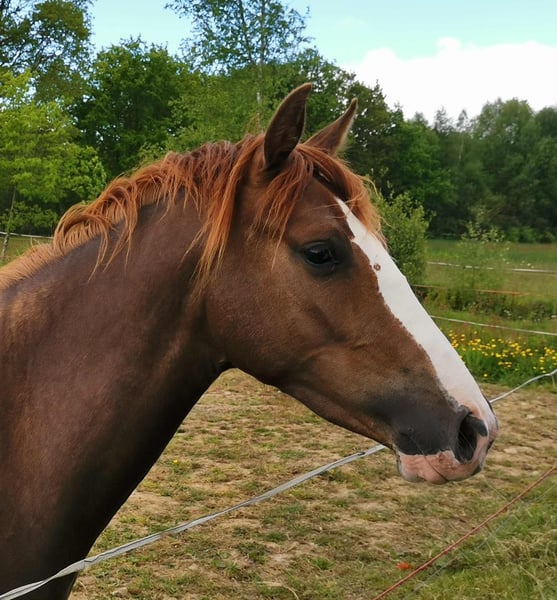 Poney Français de Selle à vendre. Jument née en 2020, de couleur alezane brûlée. Taille : 148 cm. Spécialisée en saut d'obstacles.