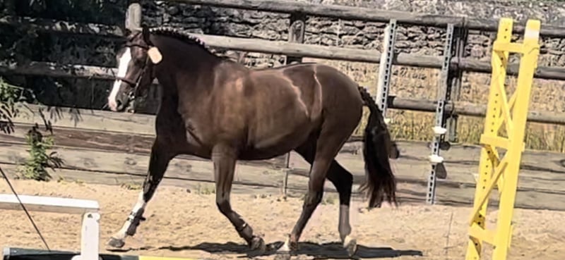 Französisches Reitpony zu verkaufen. Stute, geboren im Jahr 2020, kastanienbraune Farbe. Größe: 1,48 m. Spezialisiert auf Springreiten.