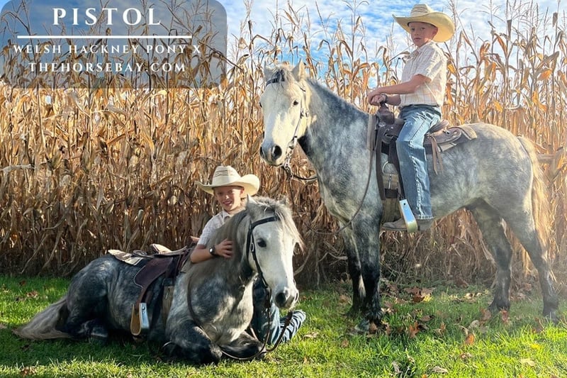Auf der Suche nach einem niedlichen Pony für Anfänger? Dann sind Sie hier genau richtig. Pistol, ein 7-jähriger, beeindruckender dappled gray Welsh Hackney Pony Cross, verfügt über die Ausbildung, um ein angenehmes Pony für jedes kleine Kind zu sein. Sein Erscheinungsbild fällt sofort auf, doch sein freundliches, sanftes Wesen macht ihn zu einem echten Vergnügen im Umgang. Seine Erfahrung auf Trails, bei Fahrten auf der Straße und auf unserem Hof macht ihn zu einer sicheren und begehrten Wahl. Pistol passt sich gut an unterschiedliche Reitfähigkeiten an und kann sowohl gemütlich die Trails erkunden als auch mit den großen Pferden mithalten. Er steht ruhig, um aufgesessen, gesattelt und gebadet zu werden. Mit seinem ruhigen, gelassenen Wesen halte ich ihn für eine ausgezeichnete Wahl für jeden jungen Reiter.