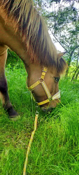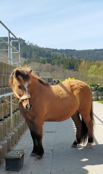 Braunfalbe mit Splash 4gängig geritten, Pass veranlagt, wurde aber nie trainiert Ich suche einen neuen Menschen für Skór. Er ist jetzt 21 Jahre alt. Leider werde ich ihm nicht mehr gerecht, weshalb ich ihn abgebe. Er ist ein Menschen gegenüber sehr aufgeschlossenes Pferd, das sowohl gemütlich als auch flott kann und gerne mitarbeitet sowie Neues lernt. Früher hatte er Probleme im Gelände, dort hat er sich nicht wohl gefühlt und wollte immer sofort wieder nach Hause. Wenn er seinem Menschen vertraut und dieser ihn einfühlsam und gleichzeitig souverän reitet, geht er inzwischen gerne ins Gelände. Er geht dann allein und in der Gruppe, in der Gruppe auch gerne flott. Weil ich mir einen sicheren Menschen mit ausreichend Erfahrung für ihn wünsche, ist er zumindest im Gelände kein Anfänger- oder Kinderpferd. In der Halle kann und wurde er schon öfter und immer problemlos von Anfängern oder auch mal einem Kind geritten. Insgesamt hat er wenig Angst und ist relativ unerschrocken. Er hat einen angenehmen Tölt, der etwas passig sein kann, nach Lockerung aber Takt findet. Er hat einen sehr guten Schritt, einen sehr sicheren Trab und galoppiert sehr schön, auch aus dem Schritt heraus und auf dem Zirkel. Er beherrscht Schulterherein im Schritt und auf kurzer Strecke im Trab, Travers in Schritt, Trab und auf kurzer Strecke im Galopp. Er wurde dahingehend viel nach Phillipe Karl und Teilen aus der Akademischen Reitkunst trainiert. Und ich bin ihn viel mit einer Kombination aus Kappzaum und Trense geritten (vierzügelig) oder einfach mit Gebiss (zweizügelig). Beides übt er auch gerne am Boden. Genauso gerne macht er Übungen aus dem Horsemanship, auch im Gelände. Skór ist seit mehreren Jahren barhuf und kommt damit nicht nur sehr gut klar, sondern läuft auch viel besser, weshalb ich mir wünsche, dass er ohne Eisen bleiben kann. Seine Hufe werden etwa alle 4-5 Wochen von einer Huforthopädin bearbeitet. Er hat Sommerekzem, das mit einer Decke und 1-2mal in der Woche einschmieren problemlos ist. Bei wenig Bewegung wird er schnell übergewichtig, weshalb er auf der Weide häufig eine Fressbremse braucht. An einem anderen Stall hat er allergisches Asthma entwickelt. Am jetzigen Stall mit guter Lage, Heulage und Offenstall ist er komplett symptomfrei und hat keine körperlichen Einschränkungen dadurch. In der Herde hat er in der Regel einen mittleren Rang, ist entspannt und eher unauffällig. Ich wünsche mir einen souveränen, einfühlsamen Menschen für ihn, der Lust auf vielseitige Beschäftigung mit einem tollen Pferd hat, das einiges zu bieten hat. Er fährt nicht so gerne Hänger, aber doch wenn's muss, geht es. Er wird nur in Offenstallhaltung vermittelt. Der Platz und der Mensch sind mir wichtiger als der Preis. Ein passender Sattel kann mitgekauft werden.