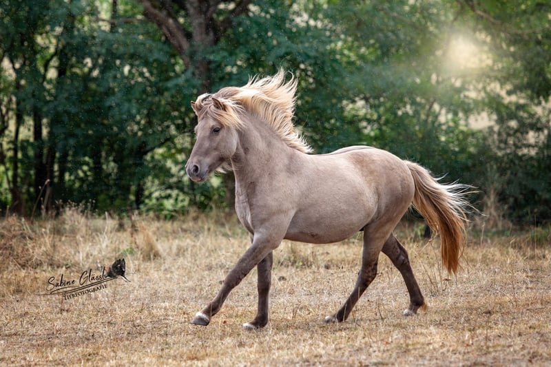 Vitnir - geboren 2020, Wallach, Mausgraufalbe mit Windfarben, ca. 135cm M: Vinka vom Sommerberg V: Eldur von den Amperauen (Bilder von Eltern ganz am Ende) Sehr schöner Islandwallach mit besonderer Farbe und tollem Charakter sucht seinen Menschen für immer. Vitnir ist 5 gängig veranlagt, hat einen guten Trab, Galopp und hat viel flüssigen Tölt. (wenig Pass). Alle Gangarten sind sehr angenehm zu sitzen und zu reiten. Er braucht natürlich noch weitere Ausbildung um alle Gangarten zu stabilisieren. Mit guter Reiterfahrung und Unterstützung mit Reitstunden sollte ausreichend sein, um ihn weiter auszubilden. Er war 2 Monate (Februar/März) in Beritt auf Hof Ruwerbach und ansonsten habe ihn bisher selbst ausgebildet. Über Sommer waren wir nur im Wald reiten und erst im Winter wieder in der Halle. Er lernt sehr schnell und ist immer freundlich, auch wenn man ihn herausfordert. Er kennt natürlich auch longieren und Doppellonge und geht als Handpferd mit. Er lässt sich brav von Kindern reiten, auch ohne Sattel und genießt es geputzt und betüdelt zu werden. Bisher läuft er barhuf und wird im Gelände mit Hufschuhen geritten. Hufpflege kennt er und ist brav. Vitnir ist ein toller Freizeitpartner für gemeinsame lange Ausritte oder Spaziergänge, in Halle und Ovalbahn ist er auch sehr gut reitbar. Er kann gerne angeschaut und probegeritten werden. Im Umgang ist er sehr lieb und höflich. Er ist in der Wallachherde sehr gut verträglich und kennt auch gemischte Herden. Ich habe ihn selbst von meiner Stute gezogen, somit ist er seit Fohlen bei mir. Er ist in einer Hengstherde groß geworden und wird seit Anfang 2025 geritten. Seine Mama kann auch bei mir angeschaut werden. Er war bisher stets gesund und ist regelmäßig entwurmt und geimpft. Ich suche für ihn eine tolles Zuhause und einen tollen Menschen. Es soll ein Platz für immer sein. Er wird nur abgegeben, wenn alles sehr gut passt. Platz vor Preis. Bitte nur seriöse Anfragen. Videos auf Anfrage.