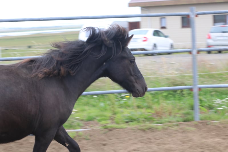 Den här unge hingsten har sin framtid ljus. Han är söt och kurioskaraktör och hans kropp och nacke är välbyggda. Han går främst på tölt när han springer ut ensam. De två sista bilderna är av hans far och hans partitur.