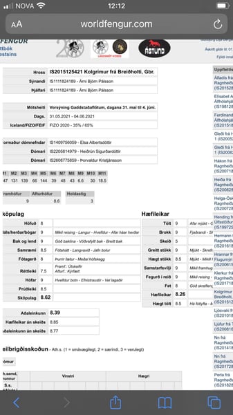 This young colt has his future bright. He is sweet and curios caracter and his body and neck are vey well built. He goes mainly on tölt when he is running out side alone. last two pictures are of his father and his score.