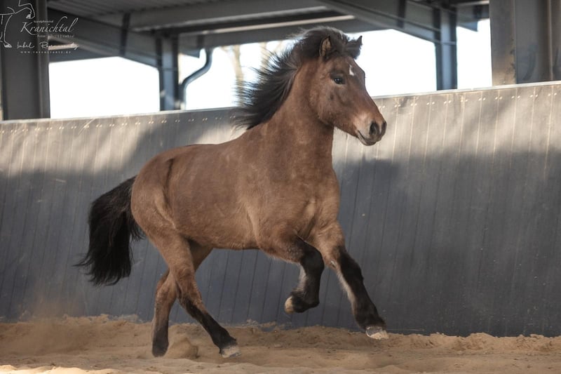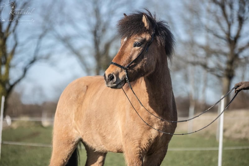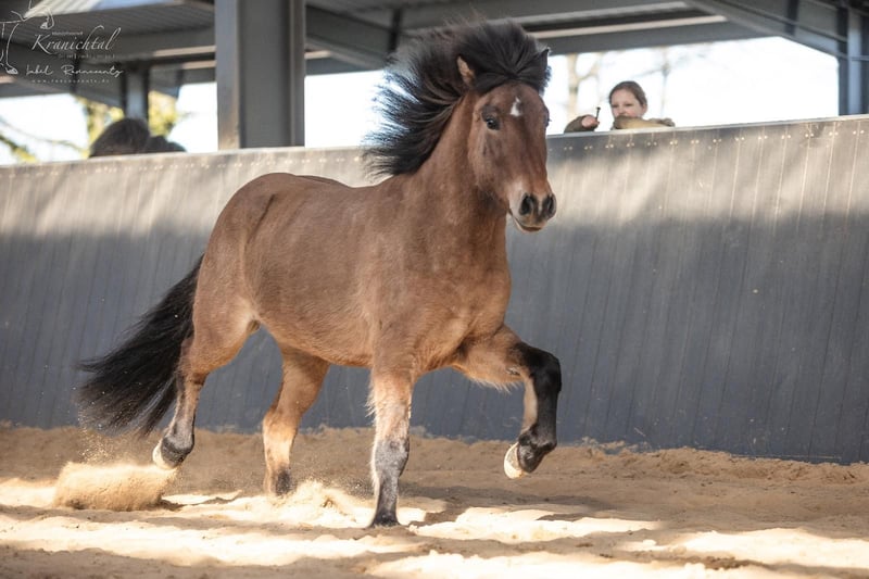 Beschreibung: Bolmur ist ein sehr großer, kräftiger und ausgesprochen freundlicher Naturtölter mit viel Ausstrahlung und Präsenz. Sein bequemer, jederzeit taktklarer Tölt lässt sich sehr angenehm sitzen und bleibt auch bei lockerem Zügel zuverlässig im Takt. Dabei verfügt er über ein gutes Temperament mit schönem Vorwärtsdrang, bleibt jedoch jederzeit gut regulierbar und angenehm zu reiten. Durch seine menschenbezogene und ausgeglichene Art ist er sowohl im täglichen Umgang als auch unter dem Sattel ein sehr angenehmer Partner. Exterieur: Bolmur ist ein sehr großrahmiger, langbeiniger und kräftig gebauter Wallach mit stabilem Fundament und guter Bemuskelung. Er verfügt über eine gute Oberlinie sowie eine kräftige Hinterhand und deckt durch seine Größe und Statur auch große und kräftigere Reiter sehr gut ab. Charakter: Bolmur ist ein dem Menschen sehr zugewandtes Pferd mit freundlichem und kooperativem Wesen. Er sucht den Kontakt, ohne aufdringlich zu sein und zeigt sich im Umgang ruhig, zuverlässig und klar im Kopf. Unter dem Reiter verfügt er über ein gutes Temperament mit angenehmem Vorwärtsdrang, das dabei jederzeit sehr gut regulierbar bleibt. Er ist aufmerksam, möchte gefallen und arbeitet motiviert mit, ohne hektisch oder überempfindlich zu werden. Gänge: Bolmur ist viergängig geritten und ein Naturtölter mit viel taktklaren, bequem zu sitzendem Tölt, ein sogenannter „Nähmaschinen-Tölt“, wie man es so schön sagt. Der Tölt ist bis ins mittlere Tempo sicher abrufbar und bleibt auch bei lockerem Zügel zuverlässig im Takt. Trab und Galopp sind gut regulierbar bei schöner Tempovarianz und guter Balance. Durch seine Bewegungsqualität und sein gutes Temperament ist er bei weiterer Ausbildung auch für den Sport interessant. Ausbildungsstand: Bolmurs Grundausbildung ist abgeschlossen. Er kann auf dem Reitplatz, in der Halle sowie im Gelände sowohl alleine als auch in der Gruppe geritten werden und zeigt sich dabei sicher und zuverlässig. Bolmur geht schön am Zügel, reagiert gut auf die Hilfen und lässt sich angenehm regulieren. Seitengänge in der Grundform wie Schenkelweichen sowie Rückwärtsrichten sind ihm bekannt und werden sicher ausgeführt. Besonders im Tölt zeigt er sich geschmeidig im Genick, gut durchlässig und jederzeit taktklar, wodurch er dem Reiter ein sehr komfortables Reitgefühl vermittelt. Wer passt zu mir: Bolmur ist ein ideales Pferd für Reiter, die einen großen, kräftigen und bequem zu reitenden Naturtölter mit gut regulierbarem Temperament suchen. Er eignet sich für fortgeschrittene Freizeitreiter ebenso wie für Wiedereinsteiger und ambitionierte Anfänger. Durch seine Größe und sein stabiles Fundament deckt er auch größere oder kräftigere Reiter sehr gut ab. Dank seiner guten Rittigkeit, seines klaren Kopfes und seiner soliden Grundausbildung ist er vielseitig einsetzbar und bei weiterer Förderung auch für den Sport interessant. Vater: Bolmurs Vater, der berühmte Hjalti, steht für eine unglaubliche Qualität der Gänge, vor allem in den Grundgangarten, gepaart mit einem starken, leistungsbereiten Charakter. Hjalti-Nachkommen sind große, langlinige Pferde mit klarer Gangtrennung, die fließend zwischen Trab und Tölt wechseln können und einen coolen, stressfreien Charakter haben ohne dabei langweilig zu sein. Von seinen zahlreichen erfolgreichen Nachkommen sei hier nur der Weltmeister 2017 in der V2 "Glæsir von Gut Wertheim" erwähnt. Mutter: Mutter Björk ist eine große kräftige Stute mit einem ansprechenden Gebäude. Besonders ins Auge fällt ihre lange und dichte Mähne, durch die Björks femininer Kopf noch mehr zur Geltung kommt. Bereits sehr früh wurde Björk geritten FEIF geprüft. Björk verfügt über einen sehr leicht zu reitenden Tölt, der bis ins hohe Tempo immer taktklar ist. Tölt ist Björks bevorzugte Gangart. Sie vererbt ihren Kindern, neben dem taktklaren guten Tölt, viel Ausdruck und das große wache Auge.