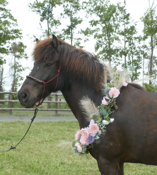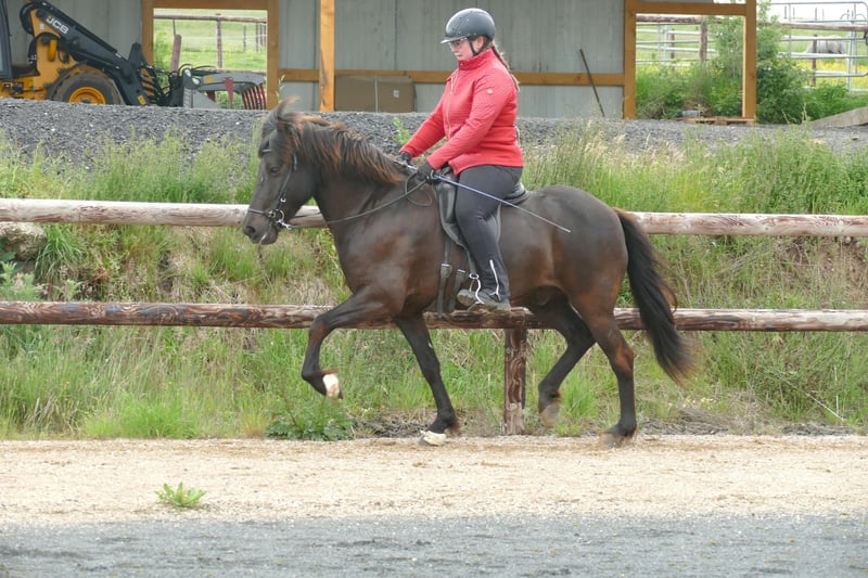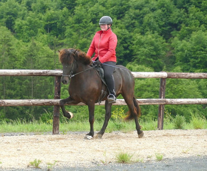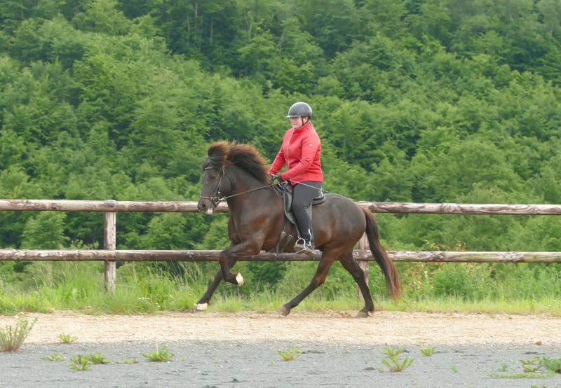 Nattar - grand Islandais, grand avenir ! Ce superbe et immense hongre noir présente un ensemble parfait pour une vie de cheval de selle idéale. Commençons par sa grande taille et sa construction harmonieuse - il peut facilement accueillir de grands cavaliers. Ensuite, il possède 4 allures au-dessus de la moyenne. Son tölt nous enchante dès le départ avec une grande amplitude et beaucoup de mouvement. De plus, il est super facile à monter et extrêmement confortable. Ses allures de base sont, comme pour un cheval à quatre allures, sûres, rythmées, expansives et montantes. Le galop est régulier, possible à un rythme tranquille et très bien équilibré. Nattar est un cheval de selle absolument honnête, avec un caractère irréprochable, qui invite à de nombreuses promenades merveilleuses. Nattar est déjà monté par des enfants en toute sécurité, les adolescents et les adultes ne posent aucun problème pour lui. En extérieur, il est intrépide, ne se laisse jamais entraîner par le groupe et tölte joyeusement le long des chemins. Dans l'ensemble, ce jeune hongre est un véritable jackpot - grand, talentueux, gentil !