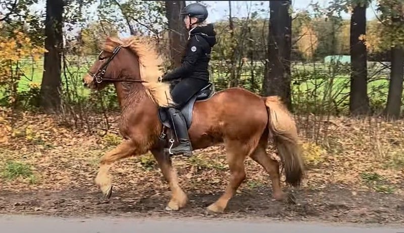 IS2018155440 Refur van Gröf – Ruin – Vosbruin met ster en snip – Vijfgang – Geboren in 2018 – Ca. 145 cm Refur – deze prachtige vosruin, geboren in 2018, is een echte hartendief. Met zijn lichte ster, zijn zachte uitstraling en zijn vriendelijke aard weet hij iedereen te betoveren. Hij is aangelegd voor de vijfgang, met veel natuurlijke tölt en laat zich bij ons al heel fijn en harmonieus rijden, met een duidelijke maat, gemakkelijk te zitten en prettig in contact. Een paard met een mooie, actieve stap, een soepele draf en een harmonieuze galop – krachtig, maar altijd kalm. Qua temperament ligt Refur in een aangename middenmoot – fijn, vooruit, vriendelijk en altijd onder controle. Een paard dat plezier geeft zonder te eisen. ✨ Ideaal geschikt voor • Ruiters die op zoek zijn naar een betrouwbaar, eerlijk dressuurpaard • Herintreders en recreatie-ruiters met ambitie • Iedereen die gevoel, vertrouwen en harmonie in het zadel waardeert Refur kwam rechtstreeks uit IJsland en heeft zich bij ons meteen braaf, nieuwsgierig en open getoond. Hij gaat rustig langs toeterende auto’s, kent zeil, vuilnisbakken, honden, tractoren en blijft daarbij altijd kalm. In het terrein is hij heerlijk te rijden – of alleen of in een groep – rustig, duidelijk, met veel töltplezier en een prettig evenwicht. 💛 Een paard dat je vanaf het eerste moment aan het lachen maakt – eerlijk, gevoelig en prachtig.