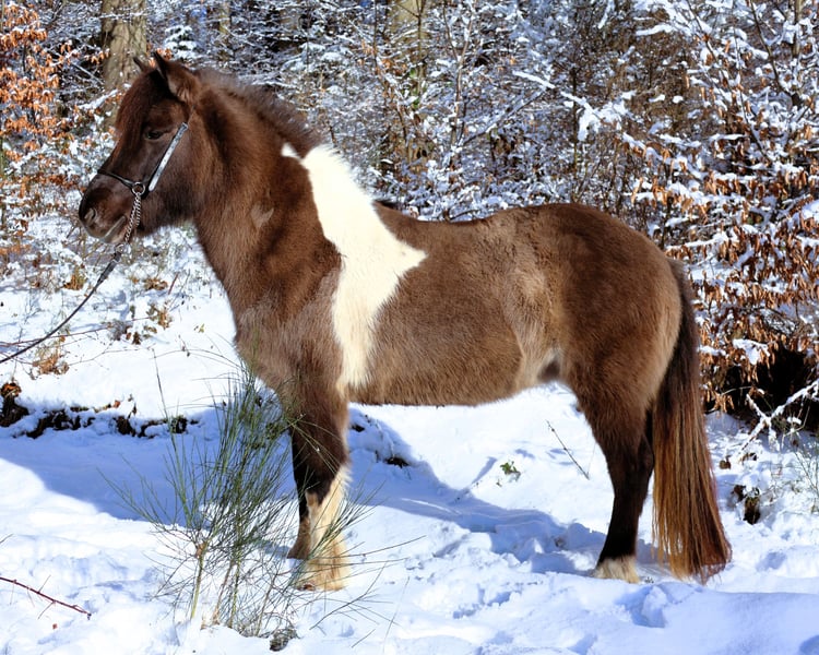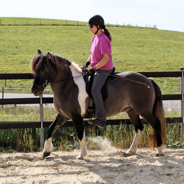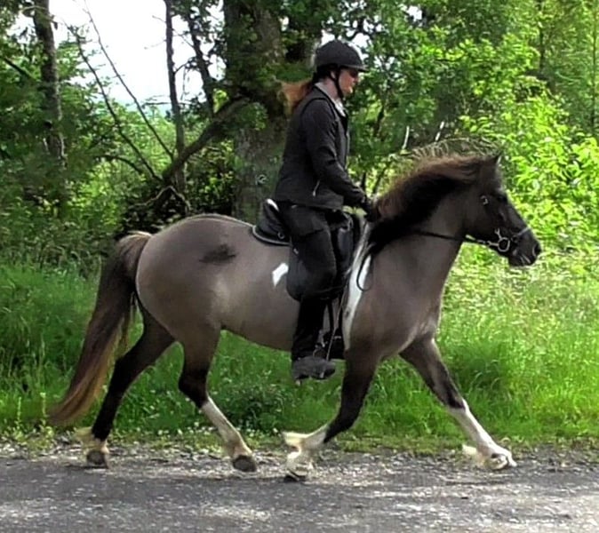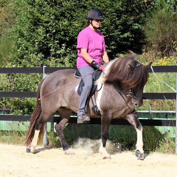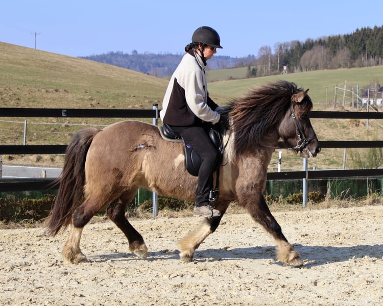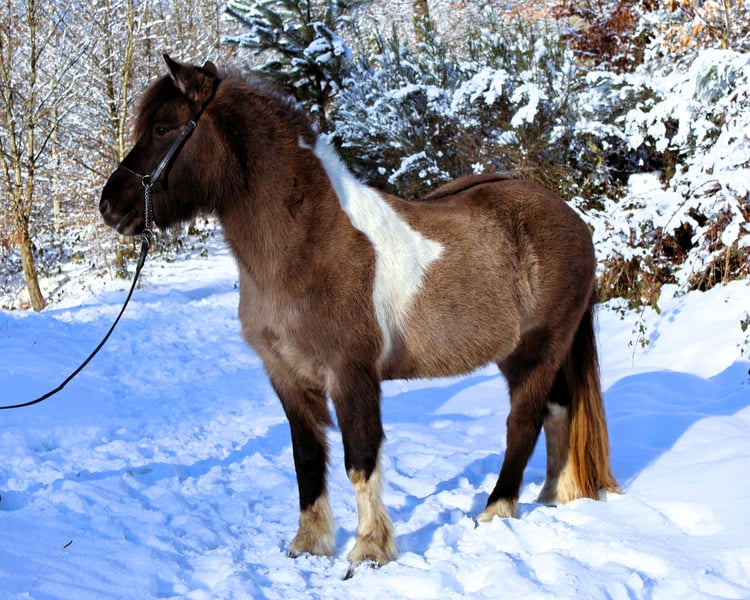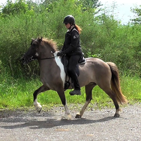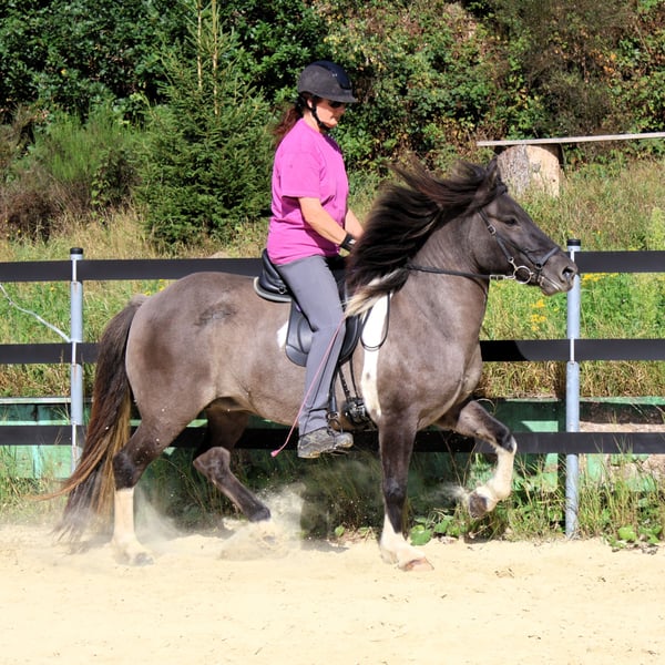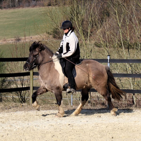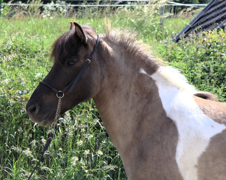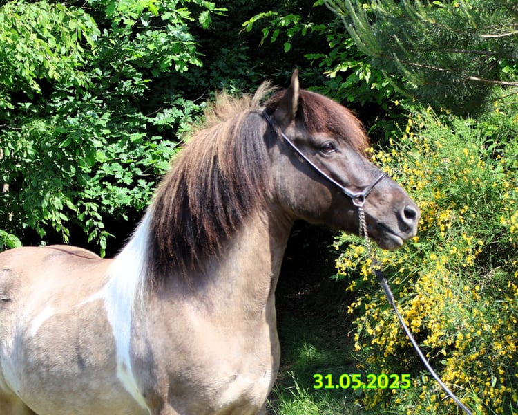 Hnísa is a large, beautiful mouse-colored pinto mare with a great character and good gaits, always friendly towards people. We liked Hnísa from the very beginning, which is why we have bred two foals with her, both of which turned out wonderfully. After weaning the last foal, we started her training in spring '24. Hnísa is familiar with groundwork, lunging, and double lunging; she is always eager and very well-behaved when out in the field. In the riding arena, she is uncomplicated and always strives to please the rider. All in all, she is a real fun horse, which we currently see in the advanced leisure riding sector. With further training, she will also make a good impression in sports. Further information and many pictures from her first day of life can be found on our homepage at www.islandpferdehof-obersolbach.de/fotogalerie/hnísa. If you are interested, we look forward to your call.