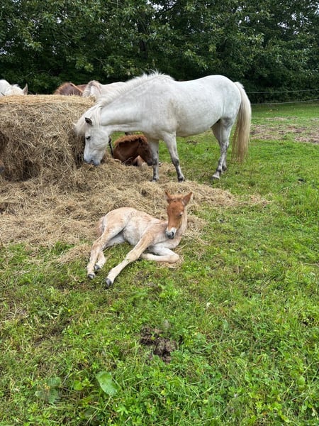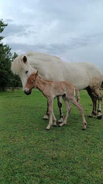 I am selling my 2014-born grey mare, Von frá Gauksmyri, as a broodmare or companion/groundwork horse. After a fully healed hoof injury three years ago, she has not been ridden and gave birth to a healthy filly this summer. She excels as a mother. The foal is not for sale, and Von is not in foal for 2026. On pasture, she moves soundly in all gaits. More details about her injury can be provided in a private conversation. Previously, Von was ridden normally and was a well-behaved leisure horse with four clearly distinct, rhythmical gaits, completely fearless and obedient, though she has a strong character. I am looking for a place for Von as a broodmare or companion in an open stable. I believe that, with gentle retraining, she could also carry children again. She is also well-suited as a therapy horse. She has always been fed haylage in my possession and has never coughed; the previous owner mentioned a dust allergy to hay. Currently, she is located in Blåvand, Denmark, and can be moved after her foal is weaned (latest by the end of March). Sire: Gandalfur frá Selfossi Dam: Valkyrja frá Gauksmyri