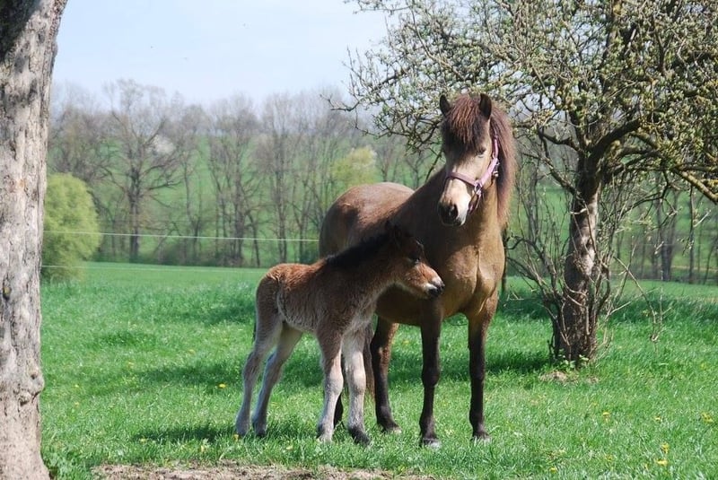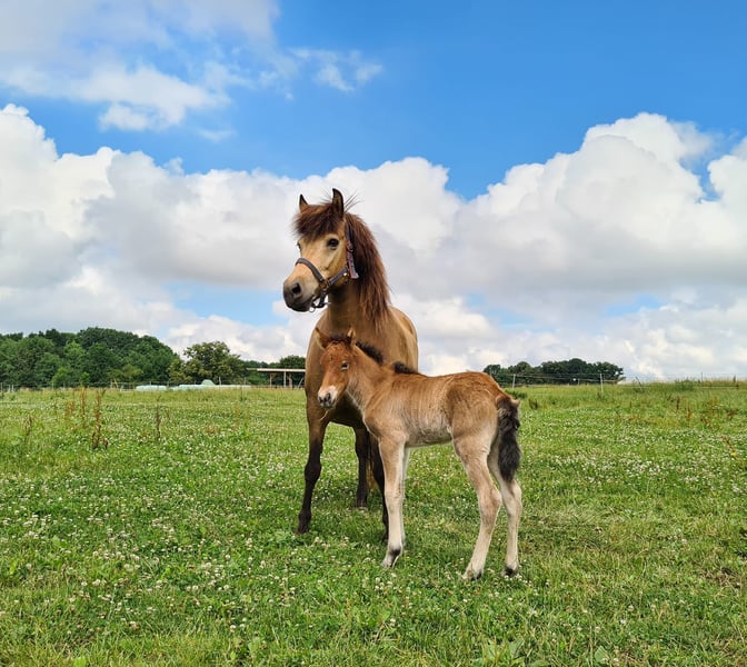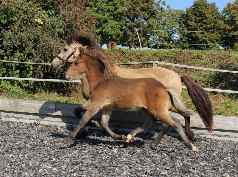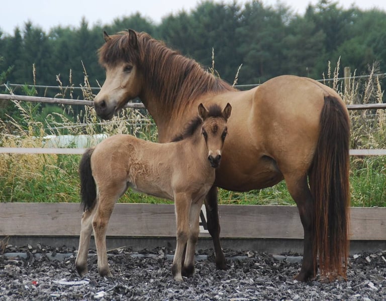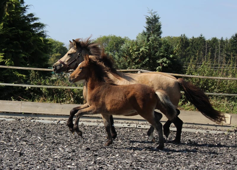 Heilla ist 2010 bei uns in D geboren und ekzemfrei. Sie wurde 5jährig angeritten und zeigte sich hier sehr einfach. Alle Gänge waren klar getrennt mit sicherem Trab und einfach zu reitendem Tölt bei gut mittlerem Temperament. Seither ist sie in der Zucht und hatte 8 Fohlen. Sie ist eine sehr gute Zuchtstute und Mutter, alle Geburten waren ohne Komplikationen, sie hat immer sehr viel Milch. Im Herdenverband nutzen die anderen Stute sie gerne als Fohlensitterin. Im Rang ist Heilla im Mittelfeld und kommt mit allen gut klar. Sie liebt Popo-kraulen. :-) Heilla ist erdfarben, rein Svadastadir gezogen (Feif ID DE2010210833) und vermutlich reinerbig Rappe. Alle ihre Fohlen haben gute Grundgangarten und viel Tölt. Besonders die Anpaarung mit Heljar frá Brekknakoti (letztes Foto) hat sich bewährt, von ihm ist sie auch tragend für 2026. Das ungeborene Fohlen ist im Preis inklusive. Sie erhielt schon mit ihrem ersten Fohlen bei Fuß die Verbandsprämie und ist im Stutbuch 1 geführt. Heilla war nie verletzt, ist aber leichtfuttrig und kann ohne Fohlen eher nicht 24/7 auf die Weide. Wir suchen für unsere Heilla und ihr Fohlen ein tolles Zuhause in artgerechter Haltung in der Gruppe mit Familienanschluss. Wir trennen uns nur schweren Herzens, da wir schon Töchter und Enkeltöchter haben, mit denen wir weiterzüchten möchten. Der Preis ist verhandelbar - Platz vor Preis.