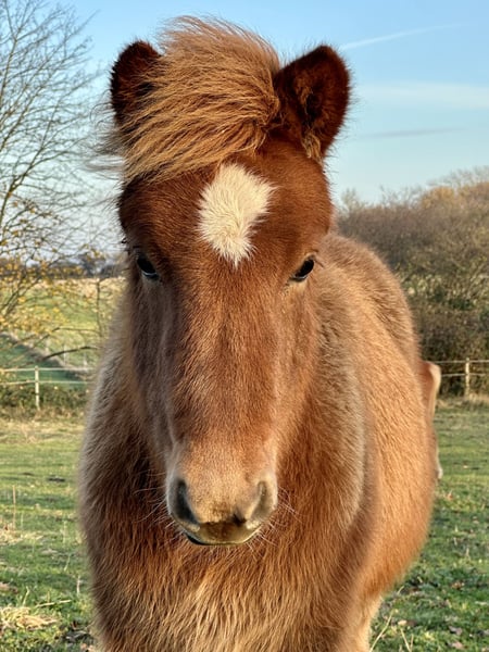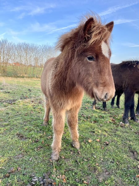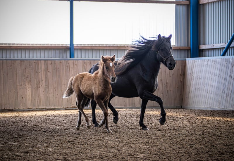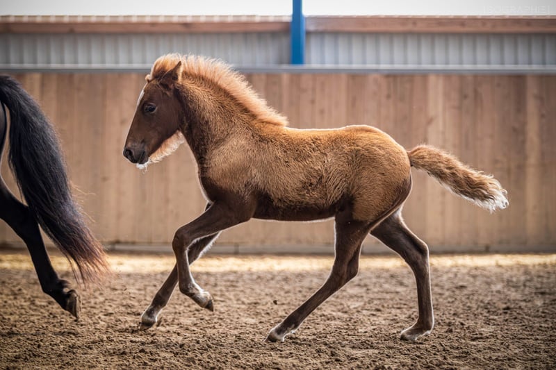 Orný ist am 29.6.25 bei uns geboren. Sie ist ein sehr feminines Stutfohlen mit endlos viel Naturtölt und feinen Reaktionen. Im Tölt zeigt sie eine große Tempovarianz. Je nach Wachstumsphase trabt sie aber auch. Sie zeigt sich derzeit im Kontakt zu Menschen eher zurückhaltend, wobei ihre Mutter als junge Stute genauso war, was sich von allein gelegt hat. Außer regelmäßige Wurmkurgaben, Umweiden, Mineralfutterversorgung und Hufe ausschneiden, machen wir nichts weiter mit unseren Fohlen, sie kommen alle früher oder später von alleine an und werden neugierig. Orný hat eine gute Abstammung: Ihr Vater ist der Elitehengst und mein WM-Pferd Ómi fran Stav (FIZO 8.29), dessen Nachkommen in erster Linie große, hünsche Pferde mit viel Behang, klarem Naturtölt und erstklassigem Charakter sind. Ihre Mutter ist eine junge Stute aus einer Eliteanpaarung: Ihre Mutter erhielt 8.28 Punkte und ihr Vater Akur frá Kagaðarhóli sogar stolze 8.63 Punkte. Orný erhilet bei ihrer Eintragung vom Pferdestammbuch die Fohlenprämie. Derzeit läuft sie noch mit ihrer Mutter bei Fuß, könnte aber jetzt abgesetzt werden und umziehen oder den Winter noch in ihrer Herde bleiben.