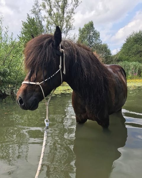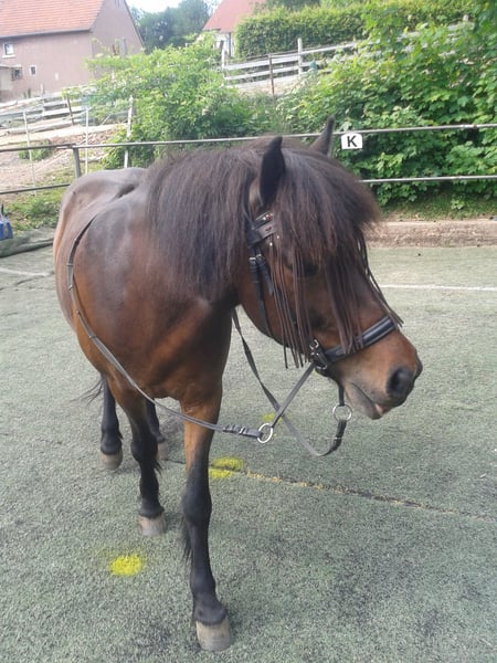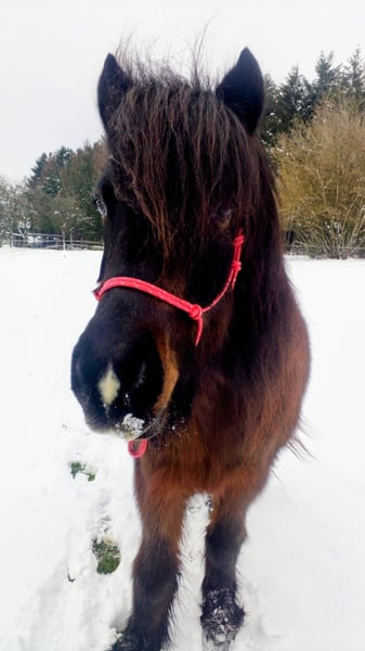 High-ranking leisure horse Riding Parelli groundwork Lunging Therapeutic riding Moderate temperament Sleigh riding Riding without saddle Barefoot hoof boots Hay dust allergy Only damped hay, steamed hay, or haylage Straw is not an issue Haylage for the past 3 years Previous injury at age 3 in front leg, healed without issues To be sold only to a species-appropriate environment with turnout and contact with other ponies Transport within a 100 km radius possible, costs to be covered by the buyer