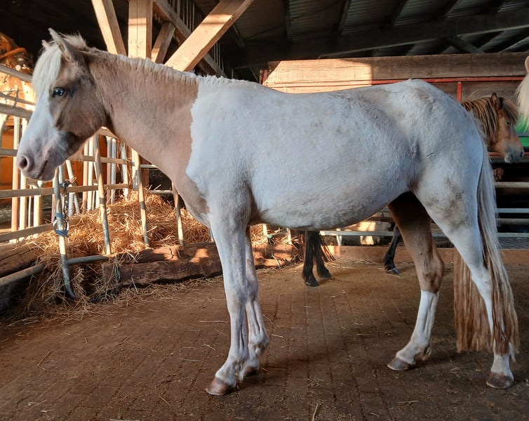 Ik bied mijn bruinvalkwindkleurige merrie uit 2023 aan in geschikte handen, bij voorkeur in maritieme nabijheid, voor een aantrekkelijke prijs. Helaas is ze dit jaar begonnen met schuren en zoekt daarom een andere plek, het liefst een plek met minder muggen of waar men meer tijd heeft voor haar intensievere verzorging. Op dit moment is het nog niet duidelijk of het slechts een groeigerelateerde tekortkoming is, of een stressgerelateerde reactie die aanhoudt. Momenteel krijgt ze een kuur hiervoor en mag daarom ook niet voor de fokkerij gebruikt worden. Ouders en grootouders, evenals halfbroers en -zussen, zijn eczeemvrij, dus het is niet duidelijk waarom en waar het vandaan komt. Met eczeemdeken vertoont ze relatief geen symptomen, deze kan meegegeven worden. Ze is op dit moment geschat op ongeveer 135 cm schofthoogte en goed ontwikkeld voor haar twee jaar, natuurlijk is ze nog niet volgroeid. Qua karakter is ze totaal vriendelijk en relaxed, een potentieel absoluut brave gezins- en recreatiepaard met de optie voor cursussen, buitenritten en meer. Ze toont in de vrije loop duidelijke, goed aanwezige basisgangen met veel ruimte en goede bewegingen. Tölt is soms zichtbaar in de overgang en is goed aanwezig. Ze heeft volledige papieren en haar extravagante kleur is via een gentest bevestigd. Verder is ze gezond en onopvallend, wordt sinds de geboorte regelmatig ontwormd, heeft hoefverzorging gehad, is gevaccineerd tegen tetanus en influenza en staat 24/7 op voer met mineralenvoorziening. Jongpaardmatig gehanteerd, is ze absoluut braaf in de omgang en ook hoefverzorging- en laadvriendelijk. Bij serieuze interesse kan ze graag bekeken en leren kennen worden, de foto's zijn van dit jaar. Verkoop alleen binnen de EU.