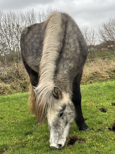 Skinna ist eine große (momentan knapp 1,40m), 2jährige Rappschimmelstute, die beim Züchter sorgfältig betreut und in einer Stutengruppe aufgewachsen ist. Der Vater ist der Fuchsschecke Leikur vom Uhlenhof (gekört, geprüft mit 8,08), der seine Charakterstärke und sein stabiles Fundament vererbt. Die Schimmelfarbe hat sie von ihrer Mutter. Skinna ist Neuem gegenüber gelassen und neugierig. Sie ist halfterführig, kennt Hufe heben und bearbeiten, Hänger fahren und Jungpferde-Schrecktraining. Ansonsten ist sie altersgemäß roh und wird bei sachkundiger Ausbildung aufgrund ihres guten Körperbaus und ihrer Größe sicher ein hervorragendes Freizeitpferd.