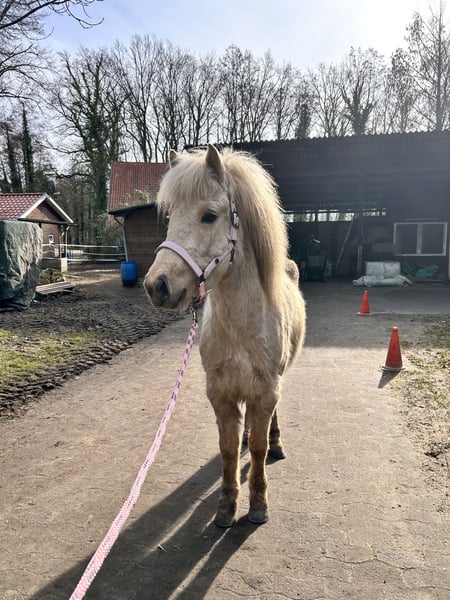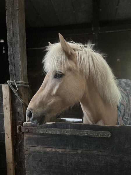 Beautiful young Icelandic mare in a special Isabell color seeking an experienced home. She is four years old and still has a lot to learn – a true diamond in the rough for someone with patience and experience in handling young horses. She currently measures 1.40 m, is well-behaved when grooming, tacking up, leading, and is happy to give her hooves. She has not received much training yet, as she only arrived from Iceland in December 2024. She is likely five-gaited, with her current focus mainly on trot and canter. With proper training, she will undoubtedly become a very special riding horse for the advanced leisure rider.