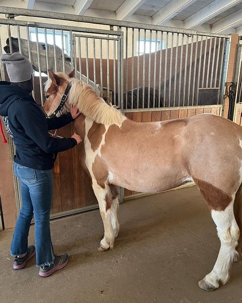 Bailey is een prachtige IJslandse paard, ze is 145 cm hoog, draagt uitstekend. Ze is vooral opgegroeid tussen boerderijdieren en is een paar keer meegeweest op jacht, dus het is geen probleem om haar bij andere dieren te hebben.