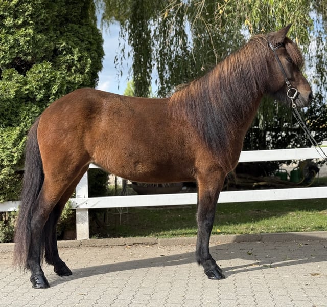 Brynja of Solhof *Born in 2020 in Austria Mare, currently 14.1 hh Brown with a lot of long hair Healthy, vaccinated, dewormed, shod ✅ Teeth done in April 2025 ✅ Currently ridden four-gaited Sire: Eldfari frá Laugaboli 7.99 (Ext 8.06, Re 7.95) Dam Sire: Borgar frá Strandarhjáleigu 8.44 (Ext 8.39, Re 8.47) ‼️ Granddam Sire: Aron frá Strandarhöfði 8.54 (Ext 8.22, Re 8.75) ‼️ Dam: Bylgja frá Höfn Maternal Granddam: Hljómur frá Horni I 8.15 (Ext 7.86, Re 8.34) ‼️ Exceptional Icelandic mare with world-class potential We are offering a highly talented mare that truly leaves nothing to be desired – neither in appearance nor in gait quality. She impresses with her striking beauty, presence, and her high-stepping, clearly articulated gait. This mare has the unmistakable potential to represent Austria in breeding and even at world championships. Her bloodlines include some of the most influential stallions of all time. Sportingly, she leaves no doubt: she has the aptitude to succeed at the highest levels of competition and consistently demonstrates elasticity, expression, and willingness to perform. Her balanced, friendly nature is especially noteworthy. This makes her not only attractive to ambitious riders but also very suitable for young riders. She provides safety and confidence without compromising on quality or performance. Sound, correctly built, and of Austrian breeding, she is an extremely valuable mare for both sport and breeding. A true exceptional horse for connoisseurs seeking top quality, future potential, and beauty in one animal. Brynja is not only an extraordinary talent but also an investment in the future of sport and breeding. She is currently in ongoing training with a focus on sport and breeding approval. She can be used immediately or further trained. If you wish to get to know and try this incredibly beautiful mare, please contact us to arrange a visit at our location in A-5221 Lochen am See.