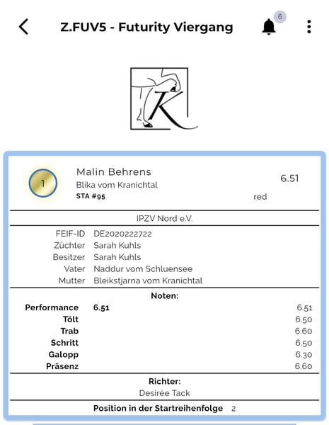 Description : Highly talented five-gaited mare with a calm, very manageable temperament and beautiful, expressive movements. She is ready to start directly and can compete in futurity competitions as a five-year-old. Exterior : Blika has a very good conformation with long lines and elegant proportions. Character : Blika is always open and friendly towards humans and everything around her. She approaches new situations with confidence and fearlessness. She is eager to work and is the first to come when you enter the paddock. Gaits : Blika is five-gaited. Her tölt has already been tested, although she has not been extensively trained for it due to her age, but there is definitely a lot of potential. She offers a very easy, rhythmically clear tölt with beautiful, expressive, large movements. She already demonstrates high-speed capacity in tölt and can perform a flying change. Her basic gaits are also beautiful and can be ridden in an appealing form at any time. Training level : Blika has completed her basic training. She responds well to aids and can be ridden alone or in a group on all arenas and in the field. She has already participated in her first competition, where she was presented in the four-gait and tölt classes in futurity and performed well and effortlessly. Who suits me : Due to her size, Blika is suitable for larger riders. Her fearless and uncomplicated nature makes her perfect for a young rider looking for a horse to start their competitive career, but she can also keep up in adult competitions. Thanks to her wonderful character, we also see her as a great leisure partner—truly an all-rounder. Sire : Exceptional five-gaited stallion. Three-time World Championship participant. Naddur vom Schluensee is a large, elite-approved Fizo stallion with a striking dark coat, who has already proven his outstanding quality at numerous national and international championships. He competed at the World Championships in 2015 and 2017. Not only has he been successful himself, but his offspring also boast championship titles, including the German Tölt Champion Náttrun vom Forstwald. Additionally, Naddur has an exceptionally friendly character, which he passes on to his progeny. Care condition : Like all horses bred at Kranichtal, Blika is free of eczema and comes from eczema-free bloodlines. Other : She can be viewed and tested ridden at any time.