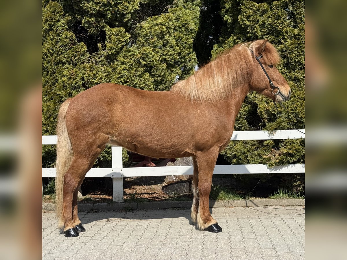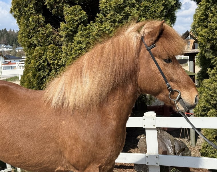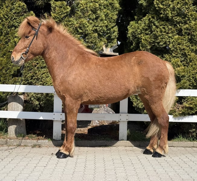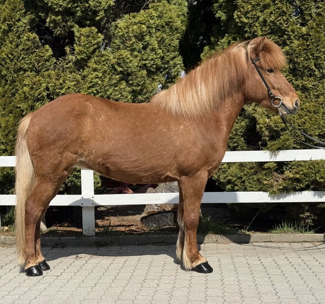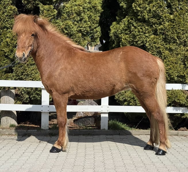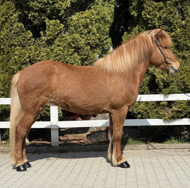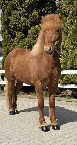 Leika vom Barghof Stute, 1,42m groß, ekzemfrei Fuchs ohne Abzeichen *2018 in Deutschland viergängig geritten entwurmt, beschlagen, geimpft✅ direkt vom Züchter V: Lagsi vom Barghof 7,70 (Ext 7,98 Re 7,52) als Viergänger, 9 für Galopp‼️ VV: Ofsi vom Barghof 7,48 (Ext 7,78 Re 7,28) als Viergänger‼️ M: Leikna vom Barghof MV: Kveikur frá Brimnesi 7,98 (Ext 8,14 Re 7,87)‼️ Leika, unsere rote Prinzessin im Stall 🥰 Selten haben wir so eine schöne Fuchsstute gesehen. Ihre helle Mähne und ihr rötlich, glänzendes Fell machen sie zu einem Eyecatcher. Ihr Charakter und wie sie sich unter dem Sattel gibt, sind ein wahr gewordener Traum. Sie zeigt vier klar getrennte Gänge mit guter Bewegung, sehr einfach zu reitendem Tölt und Galopp, den wir als Schaukelpferdgalopp beschreiben würden. Ein absolutes Familienpferd, mit top Charakter, sehr schönen, ganz einfachen Gängen und völlig unerschrocken im Gelände oder neuen Umgebungen. Wir können uns diese tolle Stute wirklich in allen Bereichen vorstellen, egal ob als Familienpferd, Sportpartnerin, Therapie oder aufgrund ihrer sehr interessanten Abstammung in der Zucht. Sie bringt ein Talent für Dressurlektionen mit, denn es ist eine Leichtigkeit für sie, sich auch auf kleineren Biegungen in allen Gängen ausbalanciert zu bewegen. Leika ist wirklich ein Goldstück und ein außergewöhnliche Chance ein absolutes Traumpferd sein eigen nennen zu können. Auch Kinder & Jugendliche können sie ohne Probleme reiten und beispielsweise im Sport starten. Aufgrund ihres ausgeglichenen Wesens können wir uns auch sehr gut vorstellen, dass Leika im Therapiebereich eine Bereicherung darstellt. Wer Leika kennenlernen und probieren möchte, kann dies gerne nach Absprache bei uns in A-5221 Lochen am See tun.