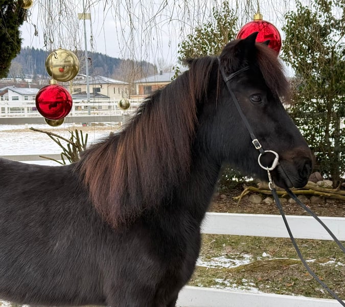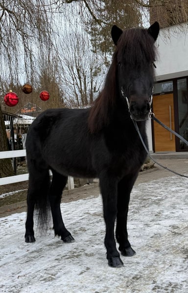 Dísa of Svennebjerg Mare, 16.1 hh *Born in Germany in 2017, free of eczema Black mare without markings Four-gaited riding horse Veterinary certificate available ✅ Sire: Avaldi frá Garði 8.05 (Ext. 7.96, Re. 8.10)‼️ Dam: Tjörvi frá Sunnuhvoli 8.46 (Ext. 8.44, Re. 8.47)‼️ Mother: Ísafold of Svennebjerg Grandfather: Viktor frá Diisa 8.63 (Ext. 8.48, Re. 8.74)‼️ Dísa is our little sweetheart in the stable. You couldn’t find a sweeter or more gentle mare. She loves being groomed and cuddles incredibly well. Due to her temperament, her delicate and elegant build, she is perfect for therapeutic riding, especially with children. This mare also brings a smile to everyone’s face because her gaits are clearly separated, incredibly beautiful, and so easy to ride that every ride becomes a pleasure. Dísa can be enjoyed as a leisure horse or ridden in sport. Her pedigree is also quite impressive, featuring well-known names like Viktor frá Diisa, making her highly interesting for breeding. She has already foaled a healthy foal. Dísa knows everything one needs to know in the terrain and is a totally cool and relaxed ride. She can be ridden alone or in a group, never tries to be first, and can always be slowed down and controlled. While she may not be the tallest mare, she has a big heart, fantastic gaits, and working with her is simply a lot of fun and a huge pleasure. Anyone interested in meeting and trying our adorable mare is welcome to do so by appointment at our place in A-5221 Lochen am See.