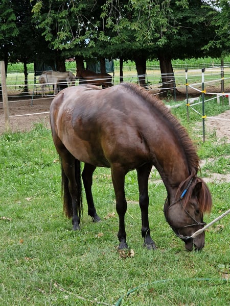 Zum Verkauf steht eine wunderschöne Islandpferdestute, geboren 2017 in Deutschland. Nepja hat ein Stockmaß von 137 cm, im stämmigen Islandtyp, ist gesund und Ekzem frei. Nepja kam mit 5 Jahren zu uns aus der Aufzucht. Wir haben sie sehr schonend angeritten. Sie hat eine solide Grundausbildung und wurde bei uns überwiegend im Gelände geritten. Sie geht brav alleine oder in der Gruppe ins Gelände und ist dabei unerschrocken. Nepja ist 4 Gänger, wir haben sie aber bisher nur 3 gängig geritten. Sie bietet Trab an der angenehm zu siitzen ist, Tölt haben wir nie gefördert, für uns war es okay sie so zu reiten mit dem was sie anbietet. Die Stute ist sehr menschenbezogen vom Boden aus, wenn man regelmäßig mit ihr arbeitet kommt sie auch auf einem zu im Offenstall. Beim Reiten ist sie unkompliziert, sie reagiert sehr schön auf die Hilfen und man hat nichts in der Hand. Generell kann man sagen, dass sie fein zu Reiten ist. Rund um eine sehr liebe und bemühte Islandstute die gut vorwärts geht aber immer händelbar ist. Wir wünschen uns für sie eine Offenstallhaltung für die Zukunft da Nepja sehr sozial und gerne in der Herde ist. Dabei klebt sie jedoch nicht und ist leicht zu integrieren. Sie hat sehr gute Hufe. Ihre Zähne wurden regelmäßig behandelt und sie wurde regelmäßig entwurmt.