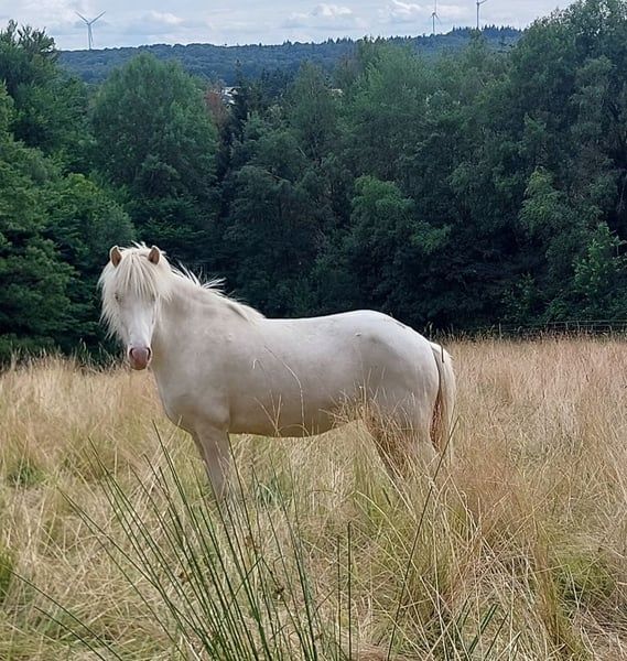 Meine schöne Titania sucht ihr für immer Zuhause. Sie ist bei mir 2016 geboren und war bis dato nur Zuchtstute, aufgrund einer Geburtsproblematik dieses Jahr sollte sie nicht mehr in der Zucht eingesetzt werden. Bis Anfang 26 hat sie noch ihr letztes Fohlen bei Fuß und kann erst nach Absetzen in ein neues Zuhause umziehen. Titania ist Ekzemfrei und Verletzungsfrei. Leider hat sie eine langsam fortschreitende Krankheit die sie bis dato nicht einschränkt und bisher lediglich im Sommer als ein optischer Makel sichtbar ist. Daher wird sie sehr günstig in beste Hände abgegeben die für sie Zeit haben mit ihr zu arbeiten. Denn leider habe ich absoluten Zeitmangel, Reduziere daher und finde das es einfach schade wäre wenn sie ab nächstem Jahr nur noch auf der Weide rumsteht ohne Beschäftigung. Sie könnte nach Absetzen ihres Fohlens ihre Ausbildung zum Reitpferd starten. Charakterlich ist sie ein Schatz der alles brav mitmacht und auch in der Herde ist sie gut sozialisiert und unauffällig im Verhalten. Ihr Temperament ist tendenziell eher ausgeglichen mit klarem Kopf gepaart mit fleiß und Lauffreude. Bei ihrer Stutbuch Eintragung überzeugte sie mit viel Tempofähigkeit in den sicher vorhandenen Grundgängen, hat dabei öfters spielend aus schnellem Trab in ebenso schnellen Tölt gewechselt so das man absolut sicher sein kann das sie reichlich gute Töltveranlagung hat. Ich gehe davon aus das sie wie ihre Mutter wahrscheinlich bei Beritt spätestens auf Bergab Strecke von selbst den Tölt auspacken wird. Auch wenn sie Freilaufend bis dato Pass nicht gezeigt hat gehe ich dennoch davon aus das dieser irgendwo schlummert. Dadurch hat man aber auch sehr gut die Möglichkeit sie einfach nur Viergängig auszubilden. Durch ihre bisherige Haltung ist sie vieles gewöhnt, daher begegnet sie den meisten Sachen relativ Angst und Schreckfrei. Durch das bisherige Handling ist sie brav bei Halftern, anbinden, putzen, führen zusätzlich Hufpflege- und Verladefromm. Auch ist sie regelmäßig geimpft gegen Tet. und Infl. sowie entwurmt. Mit ihrer tollen Perlinoschimmelfarbe mit den blauen Augen und der schönen Mähne ist sie like a Unicorn oder Prinzessinenpferd. Aufgrund ihres Charakters und ihrer Art sollte sie mit passender Ausbildung sowohl für Kinder und Erwachsen geeignet sein. Durch ihr gutes Grundfundament mit ihrem eingemessenen Stm von 137 wird sie auch mühelos einen Erwachsenen Reiter bis max. 70-75 kg abdecken können. Gerne kann sie persönlich kennengelernt werden. Bitte ausschließlich nur melden wenn wirklich echtes Interesse besteht und sie den Text auch gelesen haben.