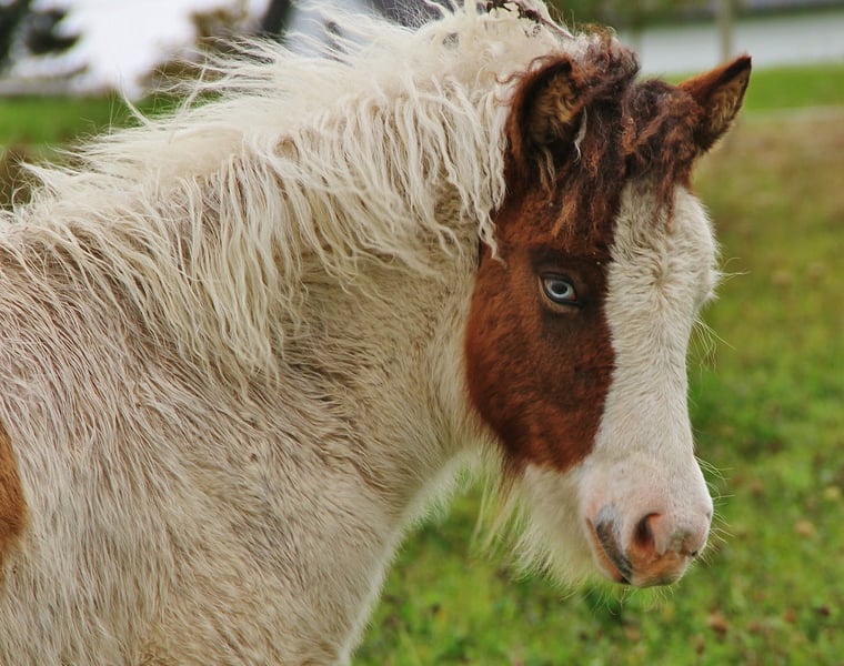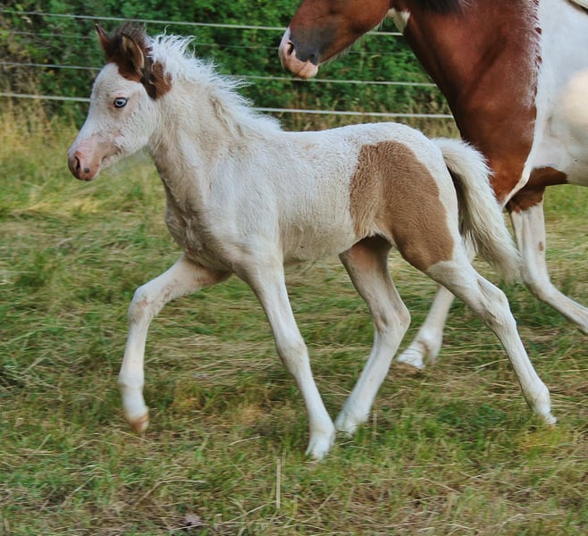 Bifröst weiß das sie bezaubernd Schön ist und zeigt dies in ihrem Ausdruck und mit ihrem leicht spritzigem Temperament. Durch ihre spezielle Fellzeichnung in Kombination mit ihren blauen Augen ist sie ein Unikat das gewiss überall auffällt. Sie ist durchgetestet und dadurch bestätigter Farbgarant, sofern sie später zur Zucht eingesetzt würde. Es liegen Tests für Falbe, ihre Grundfarbe , Splash und Tobiano vor. Demnach ist sie mischerbig Braunfalbe mit Splash und zusätzlich reinerbig Tobiano d.h. sie kann alle Grundfarben mit einer 50 % Chance auf Splash und Falbe vererben und ihre Nachkommen werden zu 100 % immer Schecken sein. Jetzt habe ich so viel über ihre Farbe geschrieben dabei ist sie viel mehr als nur Farbe. Sie hat einen freundlichen lieben Charakter der je nach Tagesform mal etwas zurückhaltend oder aber auch aufmerksamkeitssuchend ist. Fünfgangveranlagt hat sie vor allem in den ersten Lebenswochen bevorzugt Tölt gezeigt , irgendwo im Laufe ihrer bisherigen Entwicklung wurde dann auch Pass gesichtet und den Trab hat sie auch entdeckt. Ihre Grundgänge sind gut und sauber ausgeprägt, sie zeigt sie gerne mit viel Lauffreude, Bewegung , Ausdruck und guter Aufrichtung. Ihre Mutter ist eine Tochter des Heljar frá Brekknakoti der aktuell immer noch der höchst Materialgeprüfte Helmschecke weltweit ist und darüber hinaus mit seiner absolut unkomplizierten Art und Barbipferd Optik mit mega langer Mähne einfach nur ein atemberaubendes Traumpferd ist. Ihr Vater ist ein sehr schöner Braunfalbschecke mit Splash von dem sie das feine Köpfchen geerbt hat. Ein Temperamentvoller ausdrucksstarker und auch gangstarker Hengst der als Fohlen Elite geprüft wurde und auf Fizo geprüfte Hengste wie Bekan fra Kolsholti, Skardi vom Vindstadir, Glampi fra Vatnsleysu, Sveinn-Hervar fra Pufu und Djarfur fra Lukkubae zurück geht. Bifröst ist schon registriert und in World Fengur eingetragen hat also volle Papiere so das ihr alle Wege offen stehen egal ob als gehobenes Freizeitpferd, Zucht, Sport , etc. . Sie könnte mitte November in ein neues Zuhause umziehen und steht bis dahin mit anderen Fohlen zusammen auf der Weide. Dadurch ist sie gut sozialisiert, wird mit Mineralien versorgt, regelmäßig entwurmt und auch das Hufe kürzen kennt sie schon da wir bei jedem Weideumtrieb nach Bedarf die Hufe auch schon bei den Fohlen pflegen. Durch Weideumtrieb mit Pferdeanhänger hat sie auch schon das Verladen und im Hänger gefahren werden positiv kennengelernt. Es gibt von ihr kein Video und auch keine weiteren Fotos in Bewegung, da ich sie ursprünglich nicht Abgeben wollte, aber leider läuft es nicht immer im Leben so wie man sich das wünscht. Daher bietet sich hier nun für jemanden der ein ausergewöhnliches Nachwuchspferd sucht die Chance Bifröst persönlich kennenzulernen und wenn alles passt auch im November sie in ihrem neuen Zuhause zu begrüßen. Erstkontakt bitte ausschließlich über Mail. Transport innerhalb Deutschland gegen Kostenübernahme. Auf Wunsch kann vor Umzug eine Tierärztliche Gesundheitsuntersuchung veranlasst werden. Verkauf nur innerhalb der EU.