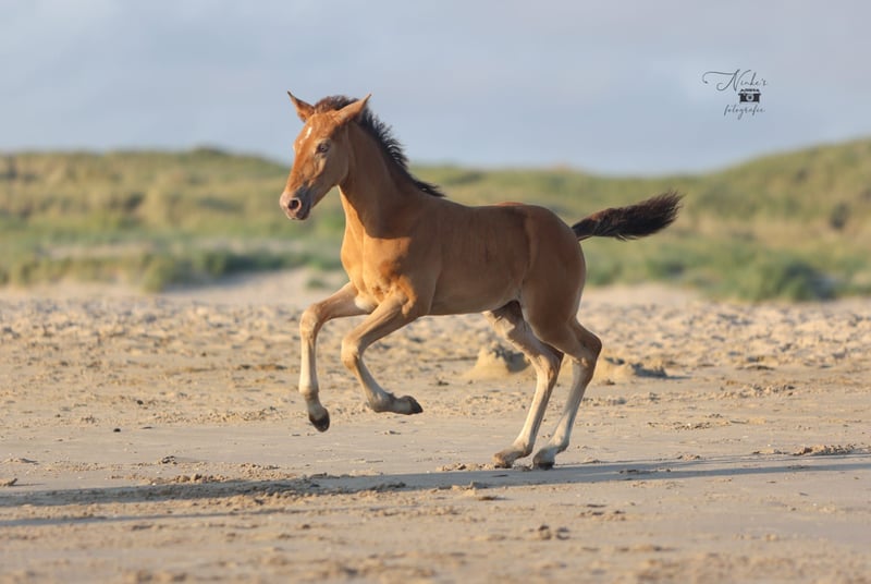 Zu verkaufen: Wunderschönes Stutfohlen Geboren am 30.05.25 Sie hat eine wunderschöne amber-champagnerfarbene Fellfarbe und wird voraussichtlich zu einer großen Stute heranwachsen, genau wie ihre Mutter. Sie wächst an der Seite ihrer Mutter in einer stabilen Herde mit verschiedenen Altersgruppen auf. Dies schafft eine gute und soziale Grundlage für die Zukunft. Abstammung: -Mutter: Zep's Pixel von den Woodystables Kreuzung Groninger Pferd x Isländer – bombensicher, stark, freundlich und vielseitig. Stockmaß 1,58 m. -Vater: El Perrier von ‘t Pietershof - Perry 43,75 % Arabisches Blut und stammt mütterlicherseits aus einer besonderen Gangpferdekreuzung (Rocky Mountain x Paso). Stockmaß 1,52 m. Kürzlich gechipt und im EASP-Zuchtbuch eingetragen. Merkmale: Gesundes und neugieriges Wesen, sehr freundlich. Schöne Statur mit starken Beinen. Besonders schöne Farbe für Liebhaber. Sie ist bereits an viele Dinge gewöhnt, wie Wald und Strand, Hufe geben, Putzen und läuft brav mit. War schon mehrmals mit ihrer Mutter im Anhänger. Möglichkeit zur Untersuchung auf DMRT3 (Gänge). Standort: Schoorl (nh) Preis: auf Anfrage Kommen Sie gerne vorbei, um dieses besondere Fohlen kennenzulernen. Eine einmalige Gelegenheit für diejenigen, die auf der Suche nach einem auffälligen und lieben Partner sind! Zusätzliche Möglichkeit: Momentan bleibt sie noch bei ihrer Mutter, kann aber gegen Anzahlung reserviert werden. Bitte melden Sie sich für weitere Informationen oder Besichtigungen. Preis nach Vereinbarung, ein gutes Zuhause ist wichtig.