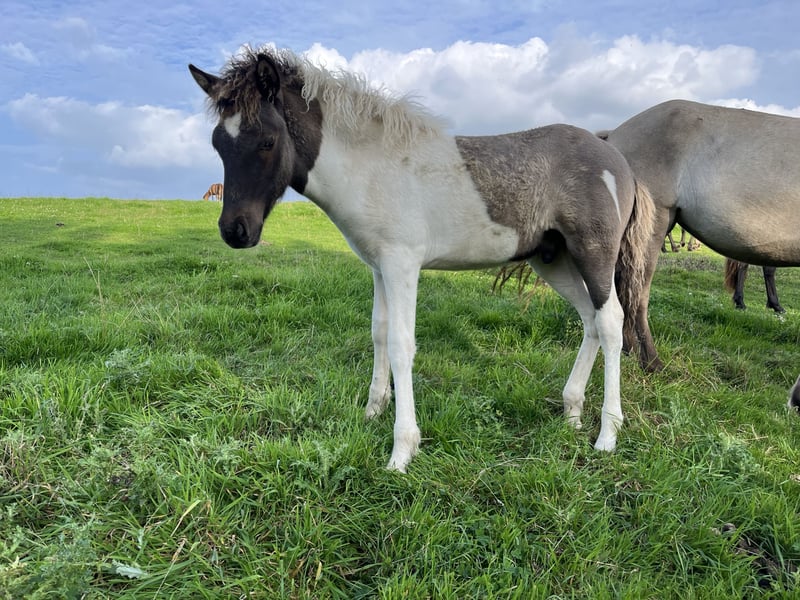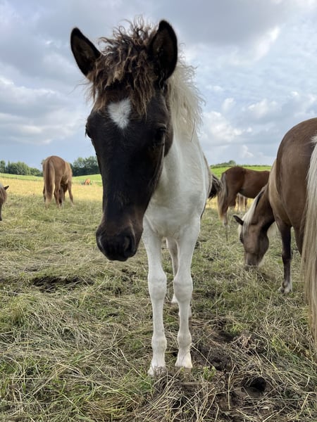 Seifur was born on May 3rd, 2025. He is an exceptionally well-developed and very large, dappled brown tobiano colt. He demonstrates four-gaited movement with a very beautiful, ground-covering trot, a similarly expressive canter, and good tölt transitions. His temperament is outstandingly easygoing; he enjoys human contact without being intrusive or pushy. Even in new situations such as loading or changing locations, he remains calm and composed. His mother is a very calm and strong riding horse with an endless natural tölt, while his sire, Öngull frá Laugarbökkum, is a licensed four-gaited stallion approved by FIZO. He promises to become a very pleasant lifelong companion and, in addition to his optimal qualities, also features a strong build and good size, making him suitable for larger riders in the future. He can be gelded from November or stay with his herd over the winter.