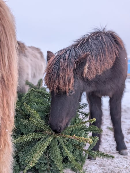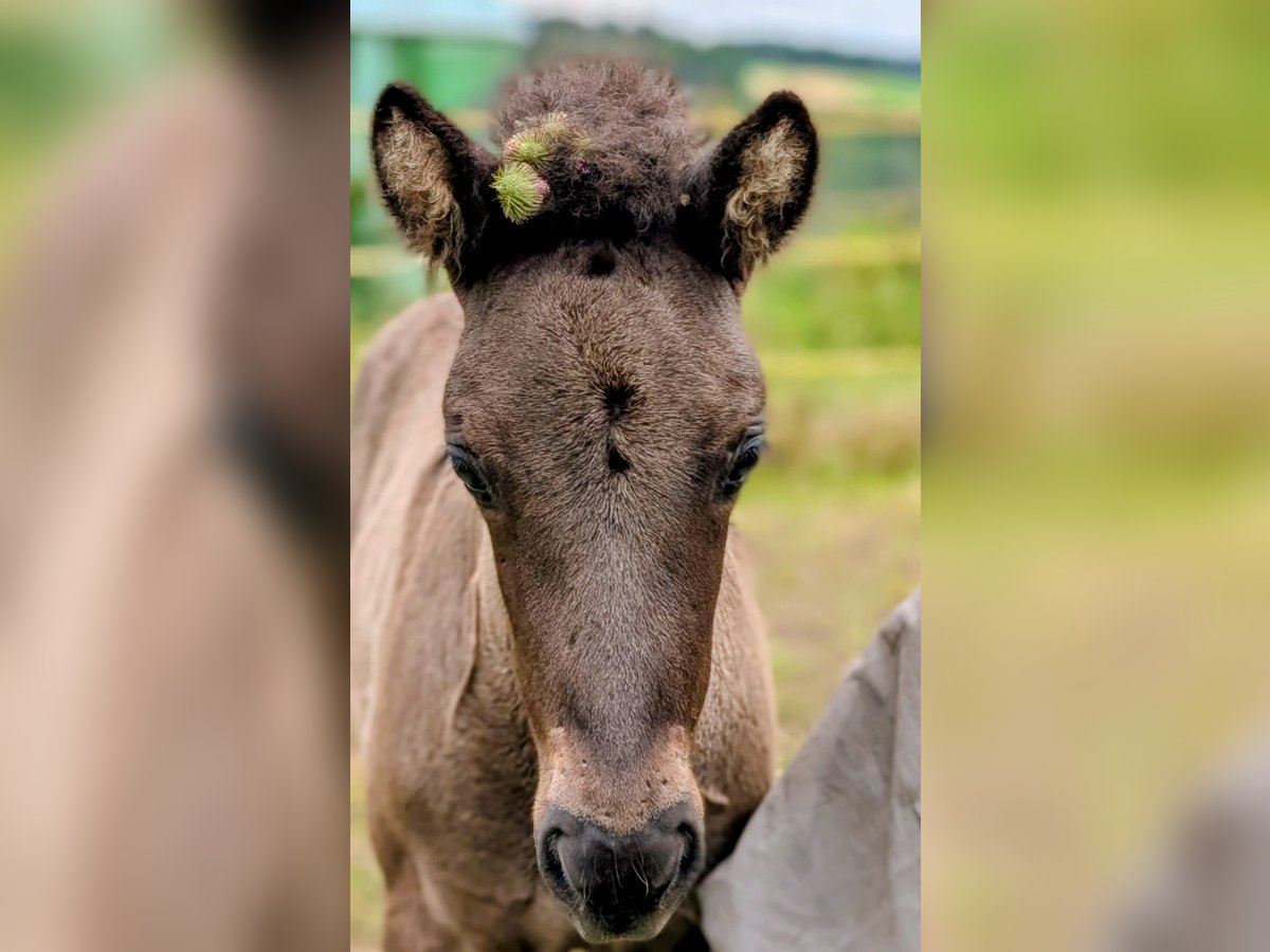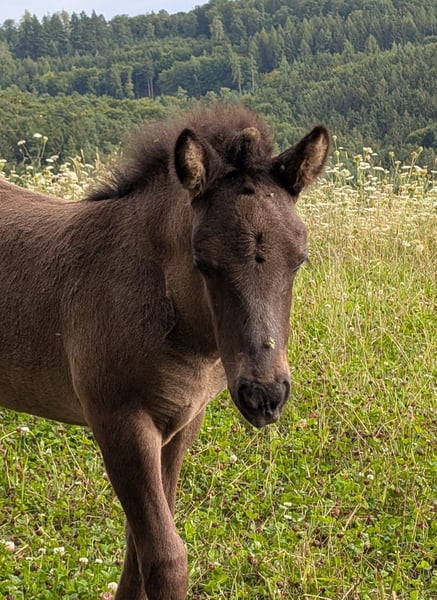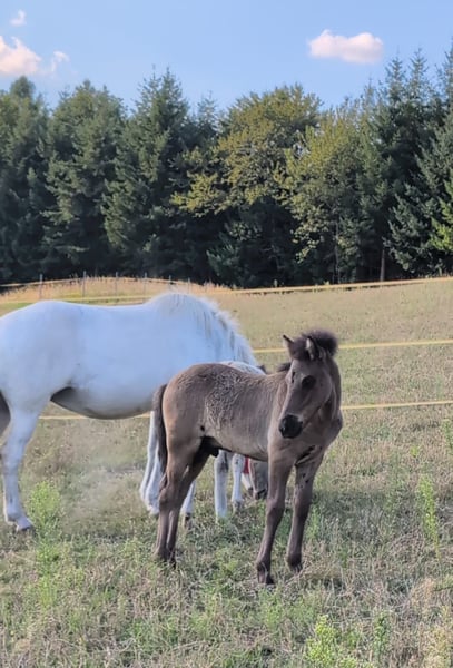 Kjartan vom Krähenfels ist ein sehr großes und gut entwickeltes Hengstfohlen, geboren am 06.07.2025. Er ist ein zuckersüßer, witziger Kerl, der sicher viel Behang bekommen wird. Er wächst artgerecht im Herdenverband auf und wurde regelmäßig entwurmt und ausgeschnitten. Er kennt das Fohlen ABC und ist dabei sehr neugierig, aufgeschlossen und dem Menschen zugewandt. Er ist unerschrocken und für jeden Spaß zu haben. Er vereint beste Reitpferdegene in seinem Pedigree. Seine Mutter ist ein absolutes Luxus-Reitpferd mit klar getrennten, bequemen und taktklaren fünf Gängen und sehr gutem Temperament. Sein Vater war 2024 mit einer Endnote von 8,20 Körungssieger in Baden-Württemberg und wird sicher noch von sich hören lassen. Er stellte 2025 das Siegerfohlen (Endnote 8,30) der Fohlenreise in Baden-Württemberg. Die beiden Brüder von Kjartan (6 und 7 Jahre alt) sind beide über 1,40 m, zeigten sich in der Ausbildung sehr unkompliziert und sind beide im Freizeitbereich, auch mit Kindern im Einsatz . Sie überzeugen beide mit sehr schönen Gängen und angenehmen Interieur. So wie Kjarten sich bis jetzt zeigt, wird er sicher in ihre Fußstapfen treten. Kjartan wurde bei der Fohlenprüfung vorgestellt und erhielt folgende Bewertung: Exterieur: 8,10 Interieur: 8,00 Gänge: 7,80 Richterspruch: "Mutiges, selbstbewusstes Fohlen mit viel Tölt, gut mittleren Bewegungen, mittlerer Tempofähigkeit und viel Freude am Laufen". Kjartan kann jetzt abgesetzt werden und ins neue Zuhause umziehen oder zur weiteren Aufzucht auf Krähenfels bleiben. Nur in allerbeste Hände. Platz vor Preis.