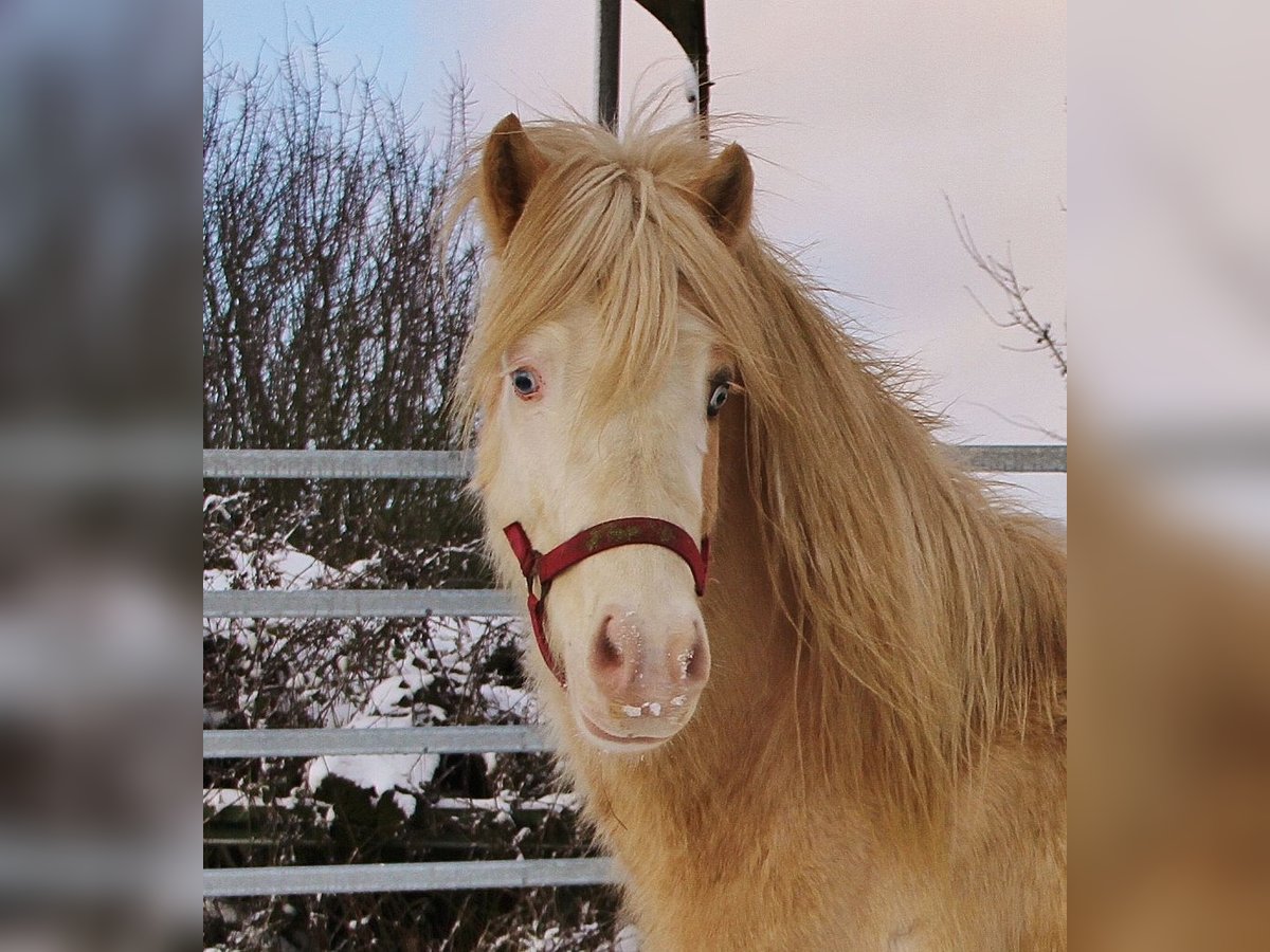 Mambo ist 2021 geboren, gesund, Ekzemfrei, regelmäßig Entwurmt, Geimpft und bis dato bestens sozialisiert in einer altersgemischten Hengstherde aufgewachsen. Er zeigt sich bei mir sehr sozial und bis dato mit wenig Hengstmanier. Leider ist er ein Kryptorchide, ist daher nicht Zuchttauglich und benötigt eine Kastration in der Klinik. Da diese etwas teurer ist als eine Standartkastration wird er für einen günstigen Preis abgegeben. Mambo bringt alles mit um ein Sportpferd oder gehobenes Freizeitpferd zu werden. Charakterlich absolut freundlich, brav und unkompliziert. Entsprechend im Jungpferdemäßigen Umgang respektvoll, unartenfrei und motiviert. Hufpflege- wie auch Verlade-fromm. Bis dato noch nicht angearbeitet da wir noch auf einen Termin zum Zähne machen warten und erst dannach mit Beritt beginnen werden. Fünfgangveranlagt mit sehr guten Grundgängen und auch immer wieder Tölt mindestens im Übergang und mehr. Seine Gänge sind raumgreifend mit schönen Bewegungen, Tempofähigkeit und viel Potential zum Fördern. Er hat stehts eine gute Aufrichtung und zeigt sich Lauffreudig mit viel Will to Please, ist dabei aber stehts ausgeglichen vom Temperament mit klarem Kopf und hört immer zu. Durch seine gute Größe von aktuell ca. 141 Stm mit sportlichem Gebäude und gutem Fundament bringt er alles mit um für klein und groß ein Reitpferd zu werden. Sein Vater ist in 2025 auf der WM gestartet und überzeugt mit Elitefizo und bester Abstammung auf Kandís frá Litlalandi, Kvistur frá Skagaströnd, Glampi frá Vatnsleysu etc. Seine Mutter ist eine Stutbuch 1 geführte Hróður frá Refsstöðum Tochter und überzeugt mit ihrer qualitativen Nachzucht auf ganzer Linie. Mambo selbst bringt noch den Eyecatcher Look eines Palominohelmschecken mit blauen Augen mit. Mit passendem Beritt und Training kann Mambo ein gutes Sportpferd werden aber auch genauso gut als gehobenes Freizeitpferd glänzen. Gerne kann er angeschaut werden. Eine Aku kann auf Wunsch veranlasst werden. Für einen Transport kann eine Spedition vermittelt werden. Die Fotos sind aktuell, leider typisch helles Pferd weiß er genau wie er sich jetzt im Winter so einsauen kann das selbst Putzen zwecklos ist. Bei echtem Interesse freue ich mich auf Kontakt.