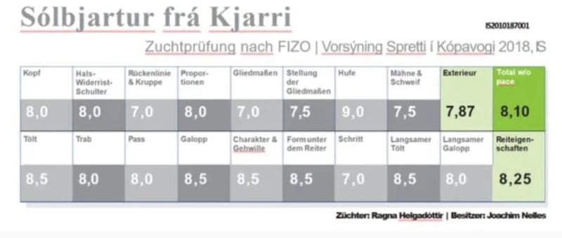 Sólbjartur frá Kjarri FEIF-ID: IS2010187001 Colores Viento Negro Característica: 5 velocidades Tipo de revestimiento: En la mano ¿Por qué es posible ser bella, aunque sea extraordinaria? Con su calificación de élite, Sólbjartur combina una vez más un gran color con un carácter único y amigable, un edificio de gran envergadura y excelentes pasillos. El semental de color viento es un verdadero caballero cuando se trata de manejo, y casi no te das cuenta de que es un semental. ¿Aburrido? ¡De ninguna manera! Bajo la dirección del piloto, Sólbjartur empieza a brillar de verdad. Su disciplina favorita es la prueba magistral T1 de Tölt, en la que ya ha recibido un 7,87 como clasificación general. Particularmente impresionante es su cambio sin esfuerzo en las diferencias de tempo, en el que los movimientos tranquilos y bailables al ritmo del trabajo se alternan con movimientos poderosos y hacia adelante. Este año todavía al precio antiguo de 750€, A partir de 2024 ¡1000€ de cuota de semental!