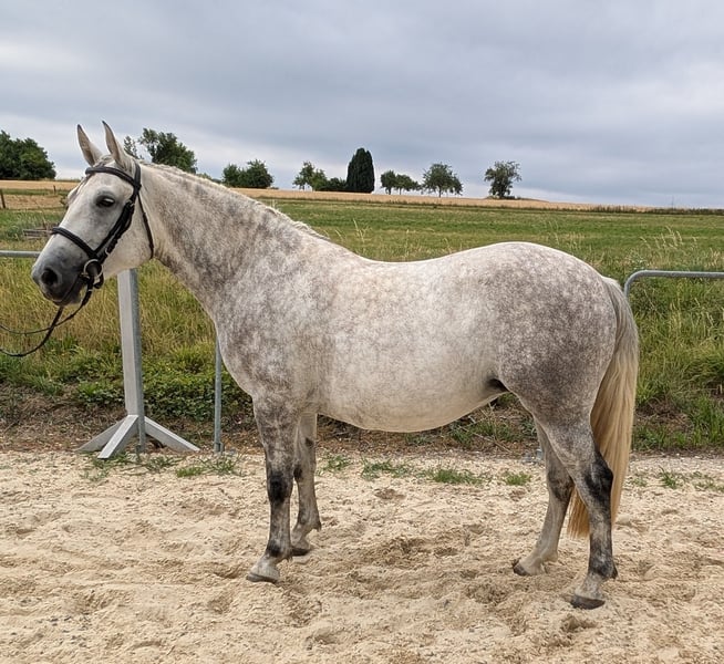 Zum Verkauf steht eine sehr hübsche 4 jährige Ponystute (Stockmaß 1,48 m). Sie ist seit Mai unter dem Sattel und geht in der Halle, auf dem Platz und ins Gelände in allen drei Grundgangarten. Sie kennt schon Working Equitation Hindernisse wie den Stier, die Brücke, das Tor und die Glocke. Sie ist ein Allrounder und auch für Jugendliche geeignet. keine absoluten Anfänger, da sie noch in Ausbildung ist. Gerne können mehr Videos versendet und nach Absprache auch Probe geritten werden.