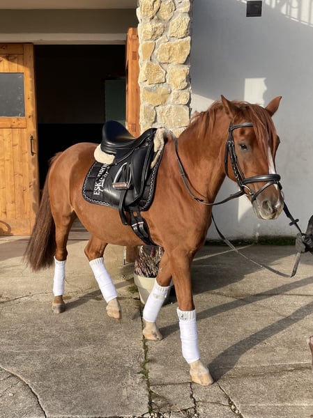 We are offering our stunning 10-year-old gelding pony with an excellent pedigree. - Weser Ems Pony - Chestnut gelding - Approved stallion - 148 cm final height - Training level E/A dressage - Quiet in the farrier and loading - Hacks out alone and in a group - Friendly and human-oriented - Familiar with open stable and box stall management - Suitable for larger riders as well Despite his many great qualities, this pony is not suitable for complete beginners. Current video available as of 09/25. Trial rides: €30, which will be deducted from the purchase price. No sales to dealers. Place before price.