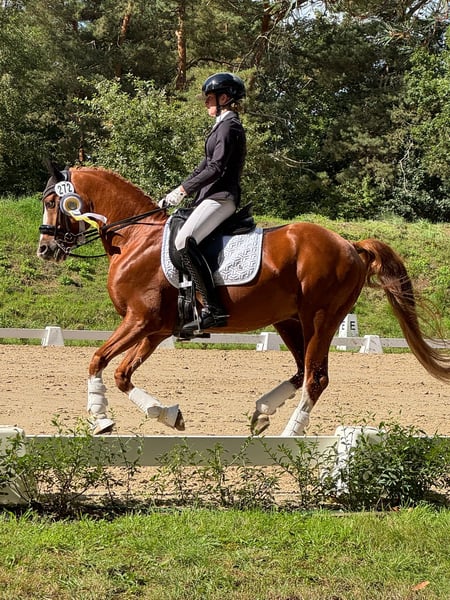 Crown is a very handsome pony gelding with an excellent pedigree. He possesses three above-average basic gaits and is very easy to ride. He is highly trained in dressage (level M) and has numerous placings and wins in L dressage competitions, including at FEI level. In jumping, he is motivated and always eager to go to the other side. He shows as much potential in jumping as he does in dressage, making him an excellent all-round pony for eventing. Currently, he is competing in A and L jumping classes. He is presently part of the national squad pony. He is consistently gentle and mentally alert, making him very manageable for young riders. He demonstrates exceptional quality in movement and jumping, ideal as a hunter for the USA. He has been licensed! Finalist at the Bundeschampionate for 5-year-old show jumping ponies. Farrier- and loading-friendly. TÜV (veterinary inspection) very good.
