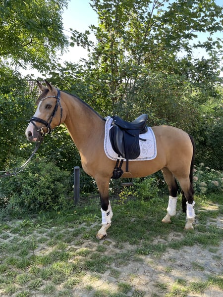 Zum Verkauf steht ein vielseitig veranlagter Reitponywallach mit drei sehr guten Grundgangarten. In der Dressur ist er bis Kl.L gefördert. Er macht aber auch einen guten Sprung und geht gerne mit anderen ins Gelände. Auf Turnieren fühlte er sich bisher nicht wohl. Deshalb wünschen wir uns für ihn einen ambitionierten Freizeitreiter, der ihn weiter abwechslungsreich fördern möchte. Da er ein liebenswerter Ponydickkopf sein kann, ist er kein Anfängerpony. Ein konsequenter Reiter wird mit ihm aber viel Spaß haben.