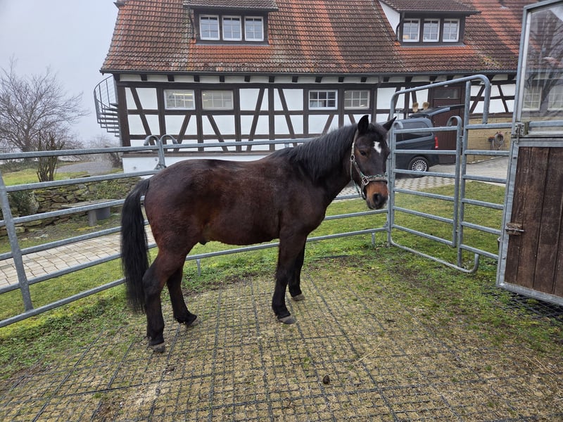 Deutsches Reitpony ca.150m. 24 Jahre, Wallach, bedingt reitbar, Schritt und Trab, Freizeit. Im Umgang sehr feinfühlig und ruhig. Er ist trotz seines Alters sehr aufmerksam und geht gut vorwärts. Spazierenreiten gemütlich altersentsprechend. Er ist kinder gewöhnt auch zum spazieren reiten. Frisch entwurmt und Zähne sind im Januar gemacht worden. Keine Boxenhaltung. Ich gebe ihn nur in allerbeste Hände ab.