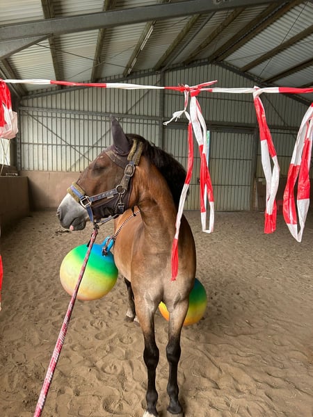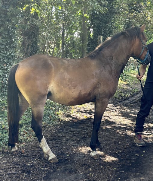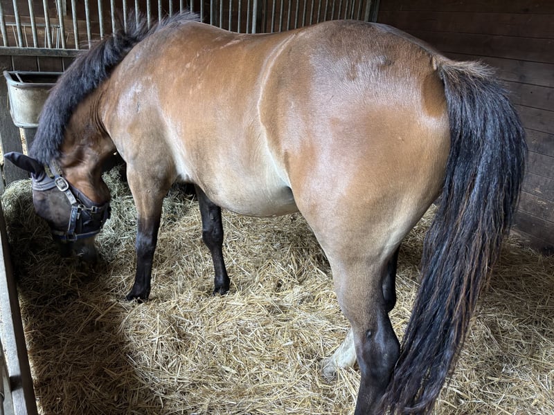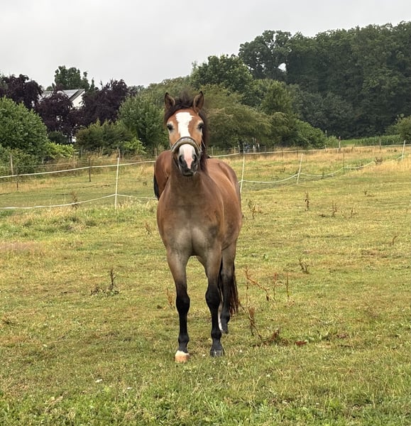 Zum Verkauf steht ein 4-jähriger Ponywallach. Loki ist ein richtiger Kumpeltyp und für jeden Spaß zu haben. Er ist in Schritt, Trab und Galopp in der Halle, auf dem Außenplatz und auf unserer Galoppstrecke am Wasser entlang geritten. Ein paar Sprünge (auch über Baumstämme etc.) hat er auch schon absolviert, dabei empfindet er große Freude und zeigt Talent. Ich kann ihn mir sehr gut als tollen Partner beim Springen und Ausreiten vorstellen. Ebenso bei der Bodenarbeit zeigt er großes Interesse, hier ist er nur noch nicht weiter gefördert. Natürlich steht Loki noch am Anfang seiner Ausbildung. Im Umgang ist er manchmal noch etwas sensibel, lässt sich aber auf alles ein. Vom Typ her ist er eher kräftig, kurz und deckt gut ab, weshalb kleinere Erwachsene super auf ihm reiten können. Eine Reiterin mit einer Größe von 1,72m und sehr schlankem Körper ist auch schon auf ihm geritten und passte prima auf ihn. Einen Termin beim Zahnarzt hat er jetzt noch vor sich. Loki eignet sich für gut reitende Jugendliche in Kombination mit Trainer/erfahrenen Eltern oder Erwachsene. 4 Jahre Aktuell 1,43m und noch im Wachstum Wallach Bei Interesse melden Sie sich gern unter der Nummer 01704320846