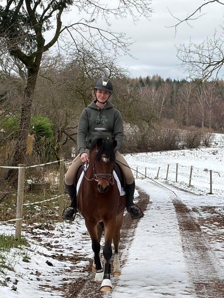 Nasz piękny wałach niemieckiego rekreacyjnego kucyka Mailo poleca się jako świetny młody koń do sportu i rekreacji. Mailo jest odpowiednio lekko zacząłsię ujeżdżać w swoim wieku i już teraz daje nam dużo radości swoją łagodnością i chęcią nauki. Jego ojciec MASSIMO w 2024 roku został wicemistrzem Niemiec w konkurencji wszechstronnych kucyków w Warendorfie. Massimo już jako źrebię robił wrażenie i był zwycięskim źrebięciem na championacie Turyngii. W wieku 3 lat odnosił sukcesy w konkursach ujeżdżeniowych dla młodych koni i mógł zostać mistrzem landu. Jesienią tego samego roku był najlepszym rocznikiem na HLP w Neustadt/Dosse z końcową oceną 8,38. W 2024 roku zaczął naprawdę błyszczeć – dwukrotnie zdobył tytuł mistrza landu, zarówno w skokach, jak i w konkurencji wszechstronnej, a sezon zwieńczył srebrnym medalem w Warendorfie! Ojciec MASSIMO, FS Mr. Right, należy do najbardziej pożądanych ogierów niemieckiej hodowli rekreacyjnych kucyków ostatnich lat. Mistrz kraju 2015 roku ma na swoim koncie ponad 45 zatwierdzonych synów i liczne sukcesy sportowe, w tym mistrz kraju Movie Star i odnoszący sukcesy w S-dressur Mr. Universum. Jego matka La Vie była zwyciężczynią konkursu czempionatu klaczy Saksonii-Turyngii oraz trzecia na krajowym pokazie klaczy. Oprócz MASSIMO, jest także matką zatwierdzonego i zwycięskiego na HLP konia Next Level oraz zwyciężczyni czempionatu Saksonii-Turyngii, La Fleur. Również w linii matki Mailo znajdują się znaczący reproduktorzy niemieckiej hodowli rekreacyjnych kucyków, tacy jak FS Champion de Luxe, Dressmann I i Darino-Gold. Z niecierpliwością czekamy na dalszy rozwój kariery Mailo.