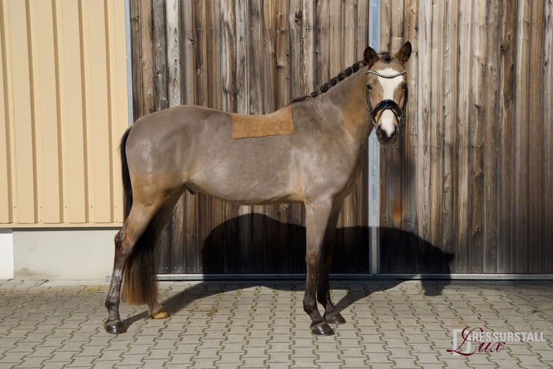 Außergewöhnliches Premium-Dressurnachwuchspony mit FEI-Perspektive Ein Nachwuchspony von besonderer Klasse und seltener Qualität: Dieser ehemals gekörte und prämierte Hengst, inzwischen Wallach, vereint modernes Erscheinungsbild, überragende Rittigkeit und höchste Leistungsbereitschaft auf beeindruckende Weise. Ausgestattet mit exzellenter Bewegungsmechanik, natürlicher Balance und großer Selbstverständlichkeit unter dem Sattel, überzeugt er sowohl durch seine sportliche Qualität als auch durch seine außergewöhnliche Präsenz. Seine besondere Farbe und ausdrucksstarke Zeichnung unterstreichen seinen exklusiven Gesamteindruck. Mehrfach erfolgreich in Reitpferdeprüfungen mit Noten bis 8,5 platziert, steht er aktuell sicher auf Dressurpferde-A-Niveau und ist sofort einsatzbereit. Seine hohe Lernfähigkeit, sein stets kooperatives Wesen sowie seine konstante Leistungsbereitschaft machen ihn zu einem hochinteressanten Partner für eine ambitionierte sportliche Zukunft im FEI-Ponysport. Im täglichen Umgang zeigt sich der Wallach absolut unkompliziert, nervenstark und zuverlässig – ein qualitätsvolles Sportpony mit hervorragendem Charakter und besten Umgangsformen. Ein TÜV ohne Befund liegt vor und kann selbstverständlich eingesehen werden. Für weiterführende Informationen sowie zur persönlichen Kontaktaufnahme bitten wir um telefonische Anfrage unter: 0152 26550431 Weitere selektierte Qualitäts-Dressurponys auf Anfrage.