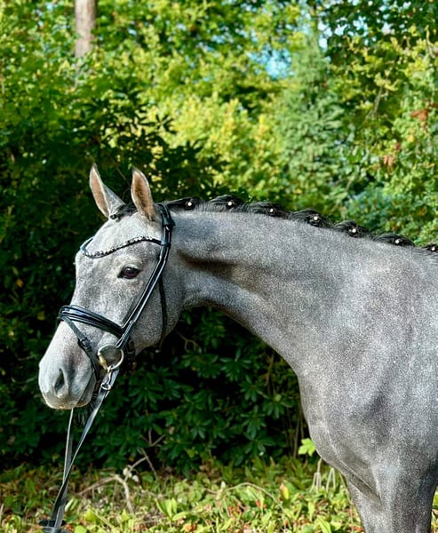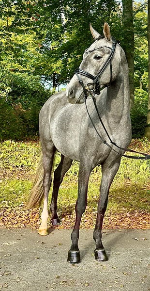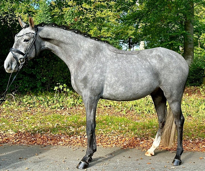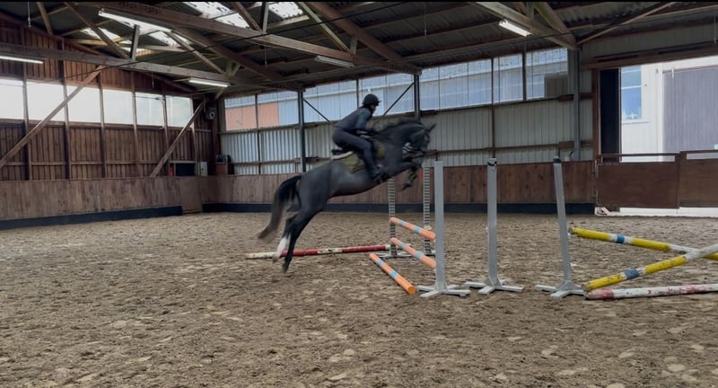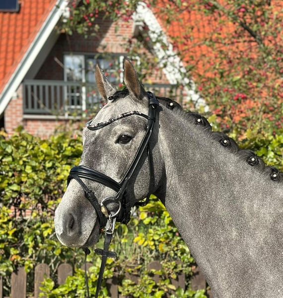 For sale is this handsome German riding pony gelding (sired by Calimero out of Bazar). He is 3 years old and already handles light dressage work quite confidently and reliably. His strengths and future focus lie in show jumping. He shows great talent and bravery over small fences, and his technique at the jump is very good. Thanks to his Thoroughbred influence on the dam side, he is also an interesting prospect as a hunter or future all-round pony, as the gelding is additionally equipped with three solid and rhythmically correct gaits. Due to his age, he is not sold as a beginner pony, as he still requires a rider who can provide him with the necessary confidence. In the future, he will undoubtedly be a fantastic sport pony for amateurs and leisure riders, as he is very calm and well-behaved in character. For those looking to bring on a young horse themselves, Cavalino will surely be a great partner to train and develop. Cavalino comfortably covers riders up to approximately 170 cm. Location: Dötlingen, 27801, Germany Viewing and test riding by appointment, of course, possible! Video available upon request.