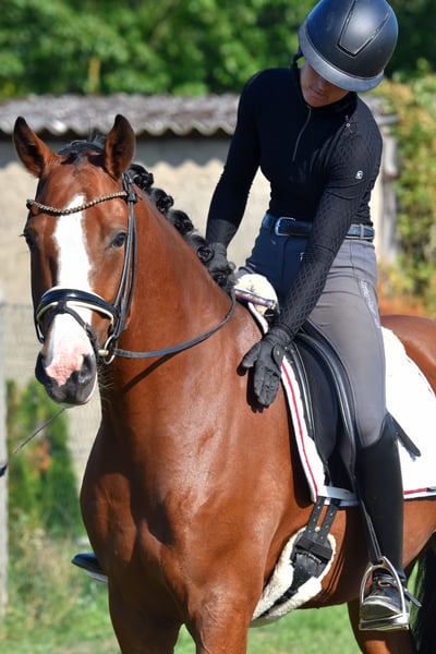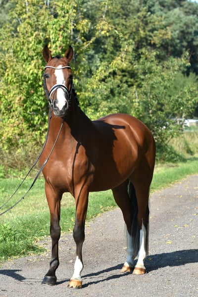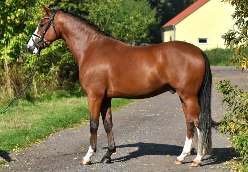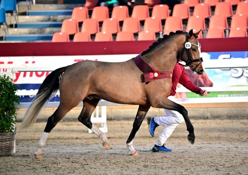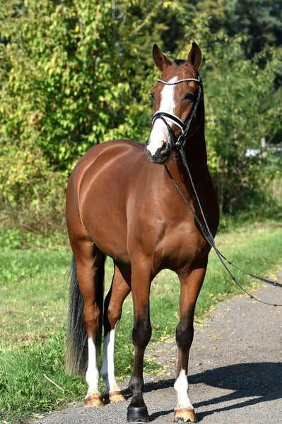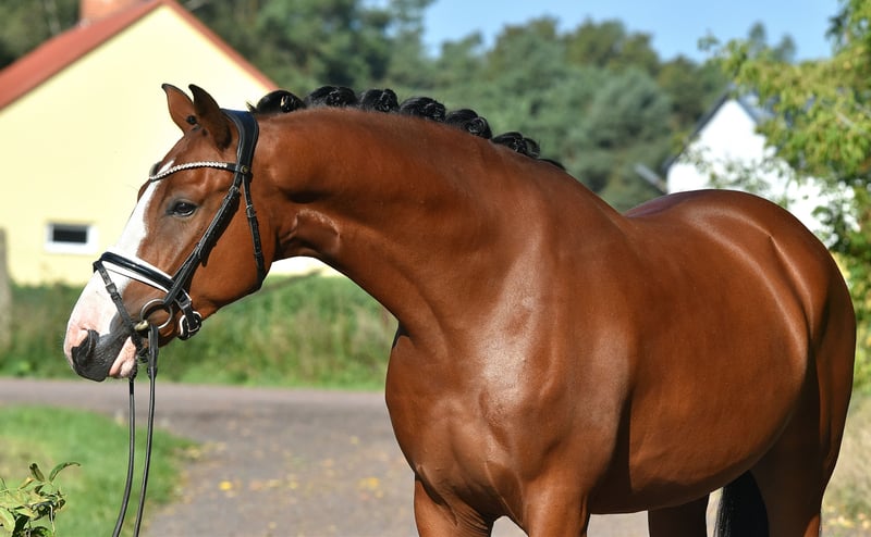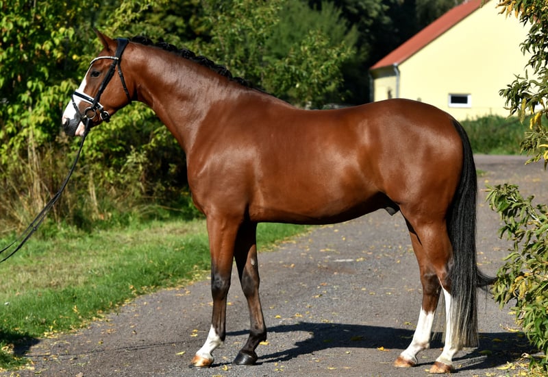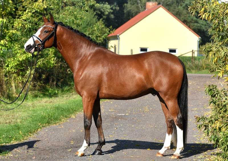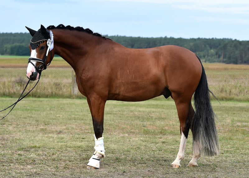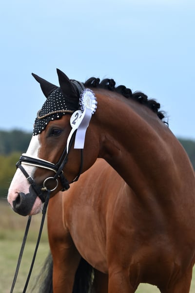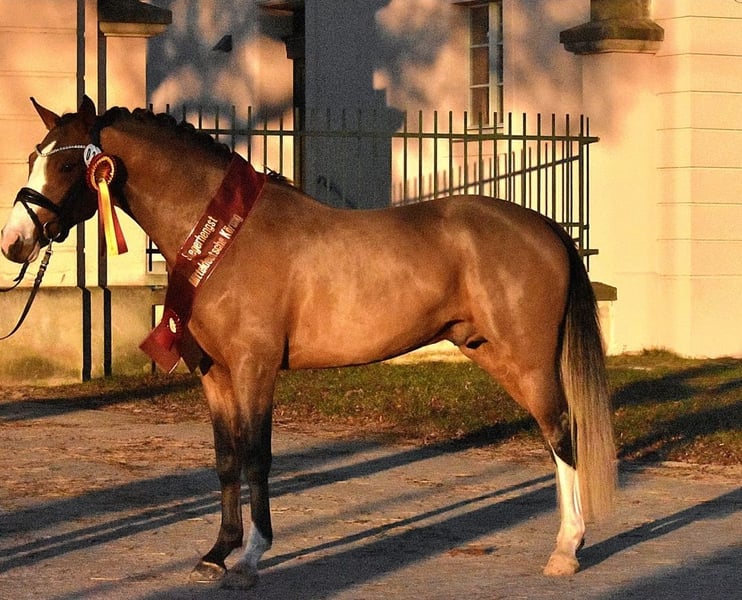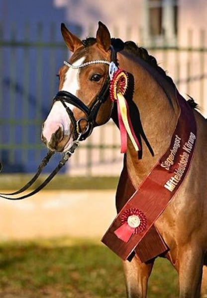Here comes Nesquick! This 4-year-old son of Fs Numero Uno has already caught everyone's attention as a young stallion and became the champion stallion of the German riding ponies in Neustadt/Dosse. He impresses with a flawless build and striking type – everything is just right! At the age of 3, he was gelded and gently started under saddle, being playfully introduced to his career as a riding pony – riding indoors and outdoors, trail riding, crossing water, etc., all of this is familiar to Nesquick. Currently, he has had the chance to experience some competition and immediately placed second in a riding horse test against warmbloods. He is incredibly rideable, with excellent contact and top quality in his basic gaits. Having now outgrown the pony size, he is suitable for both teenagers and adults. A dream pony to fall in love with! Easy to handle, he stands in the pasture with geldings. A current, comprehensive vet check including back (everything top!) is also available. A "small big one" without any ifs or buts!