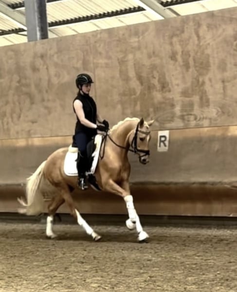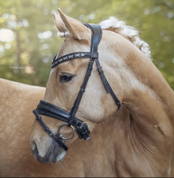 For sale is a stunning XXL riding pony gelding, born in 2022. This charming Palomino gelding stands at 153 cm and is ideally suited for dressage. Our pony impresses with his friendly nature and eagerness to learn. He is well-handled and already shows promising potential in dressage training. With his elegant appearance and wonderful character, he is the perfect partner for children or adults alike. He is well-behaved both on the ground and under saddle. The pony is healthy, vaccinated, and dewormed. He also has a TÜV (technical inspection) with no findings.