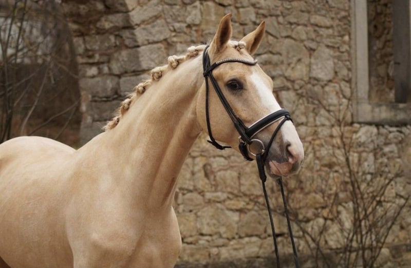 Zum Verkauf steht hier ein sehr gehfreudiger und leistungsbereiter Palomino Wallach. Goldie begeistert jeden Tag aufs Neue mit seinem Arbeitseifer. Er befindet sich derzeit in Profiberitt und kann dort jederzeit besichtigt werden. Er ist 5 Jahre alt, A-sicher und beherrscht bereits erste L-Lektionen. Im Gelände ist er brav und liebt die Abwechslung. Auch kleine Sprünge meistert er wurde hier allerdings nicht weiter gefördert. FEI Potenzial Er ist sehr menschenbezogen, liebt es zu kuscheln und genießt die Nähe seiner Bezugsperson. Im Umgang zeigt er sich freundlich und sozial, ist mit anderen Pferden sehr verträglich. Neben dem Reiten wurde mit ihm auch Boden- und Handarbeit gemacht. Er kann von Kindern oder Jugendlichen geritten werden, sollte jedoch altersbedingt weiterhin regelmäßig von einem Erwachsenen mitgeritten werden. Er zeigt sich neugierig unterschiedliche Untergründe, Planen, ein großer Ball oder wenn man hinten runter rutscht all das bringt ihn nicht aus der Ruhe. Außerdem liebt er Wasser und geht begeistert durch Pfützen. Schmied, Verladen und Tierarzt (zum impfen) sind absolut kein Problem. Er ist mit 1,47m eingemessen. Schöner Platz vor Preis