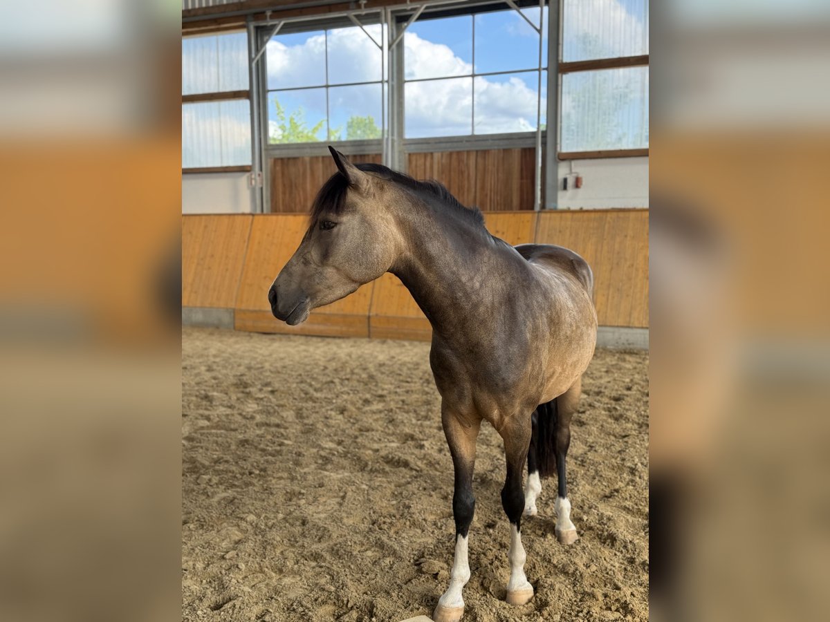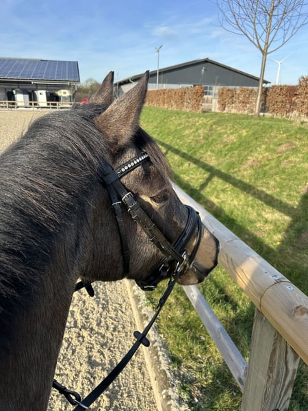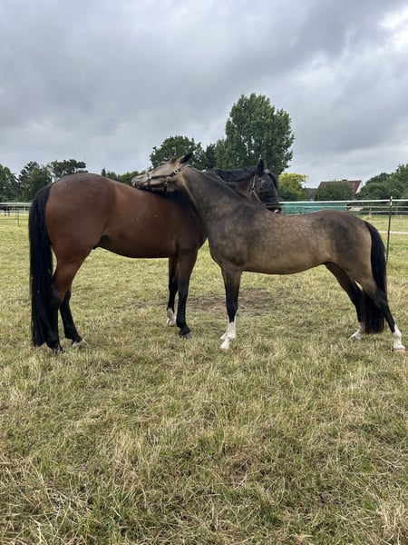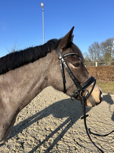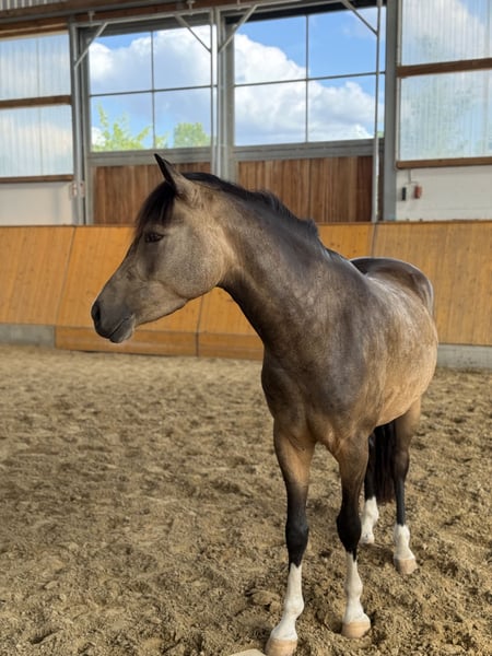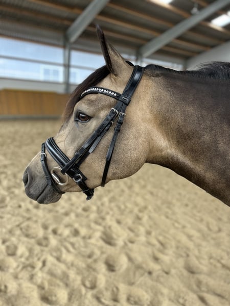 Goldi ist ein 5-jähriger deutscher Reitpony Wallach mit einer sehr auffälligen und besonderen Farbgebung. Mit seinen 1,47m steht er perfekt im Pony-Maß. Er ist ausgestattet mit drei ansprechenden Grundgangarten, wobei der raumgreifende Schritt und der gut im Bergauf angelegte Galopp hervorzuheben sind. Er zeigt sich trotz seines jungen Alters bereits zuverlässig und unerschrocken, weshalb er sicherlich ein tolles Kinderpony wird. Natürlich steht er altersbedingt noch am Anfang seiner Ausbildung. Durch seine beidseitige Veranlagung weiß Goldi sowohl im Viereck als auch am Sprung zu überzeugen. Er absolviert bereits ganz selbstverständlich einen kleinen Parcours und ist auch sonst für jeden Spaß zu haben! Im Gelände kann ich ihn mir zukünftig auch sehr gut vorstellen. Im Umgang ist Goldi absolut unkompliziert und sehr verträglich mit anderen Pferden.