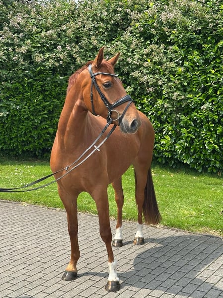 For Sale We are offering a beautiful, well-broken German Riding Pony gelding, registered in the Weser-Ems studbook, born in 2021, making him a 4-year-old. He captivates with his exceptional pedigree, which leaves nothing to be desired, as well as his friendly nature and elegant appearance. With a height of 157 cm, he is ideal for ambitious riders seeking a reliable partner horse. His sire, Celebration WE, was highly successful and a multiple winner in dressage competitions at the S level under Tanja Fischer. Unfortunately, he passed away unexpectedly last year at the age of 16. His grandsire, Relevant, also passed away in 2017 at the age of 26. Relevant was very successful in Grand Prix with rider Lisa Wilcox, achieving results over 82%, including at the World Equestrian Games in Jerez. His rider particularly praised his sensitivity and high rideability, qualities he has clearly passed on to his offspring. Genetically, this is a true rarity with great potential, one that should be secured now, as such an opportunity may not come again. He was lovingly raised by us and only recently, at just over 4 years old, was gently started under saddle by a professional rider to give him time to mature. Until then, he enjoyed carefree childhood and youth on our large pastures with his friends. He is still developing but already shows a lot of joy in work. He makes good jumps when free jumping and clearly enjoys it. He has also jumped smaller fences and cavaletti under saddle. In handling, he is initially a bit shy and reserved but quickly bonds once he gains trust. His very pleasant and friendly nature makes him strongly attached to his handler. With other horses in the herd, he is very confident and always avoids trouble without being submissive. The chestnut has been under saddle for about three months and shows great talent and willingness to develop further. His agreeable nature makes him suitable for slightly smaller, experienced riders as well as ambitious young riders. He is not a weight carrier! We wish for him a home that appreciates his unique character and talent and where he can stay. No dealers, please. X-rays have been taken and show no findings! For inquiries or further information, I am happy to be available by phone at 0171/5874944. A trial ride is possible by arrangement, but we charge a fee, which will be credited towards the purchase price, to prevent riding tourism and to protect the horse.